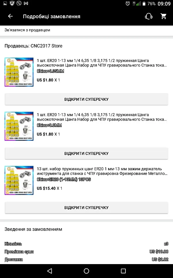 Опис товару відверто заплутаний! На фото лоту 13 цанг розмір ом від 1мм-13мм. Піднизом фото напис з кількістю 10цанг на комплект, а в описі товару вже 13цанг на комплект, яка інформація з предявлених ним відповідає дійсності знає тільки він сам! Купив цей лот комплектом як 13pcs ER20 спираючись на опис лоту і фото кожного розміру цанг, а отримав тільки 10шт????
