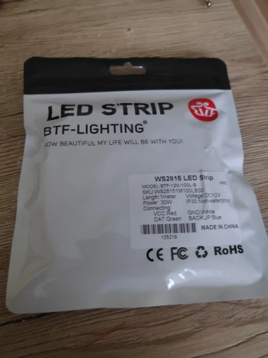 Заказал WS2815 5m 30LED/m и получил именно то. Доставка была быстрой и хорошо упакована. Я пробовал быстрый тест с Arduino, быстрый libary и проверил все светодиоды для работы. Обратите внимание, эта Светодиодная лента требует 12 В, поэтому я подключил контакты питания светодиодов к дополнительным 12 В. Сигнал передачи данных 5 В, поэтому вы можете управлять с Arduino Datapin. (убедитесь, что GND соединены вместе: Arduino и PSU для светодиодной ленты) Все было хорошо, каждый светодиод загорается и показывает цвет, который я хотел показать.