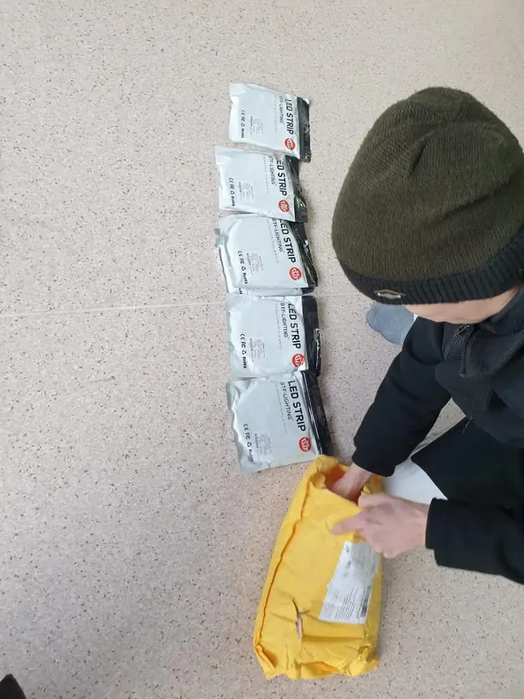 Доставили очень быстро. Упаковка была не очень - просто смотали скотчем отдельные упаковки 4-х катушек с лентой и контроллера. Могли бы в одну общую упаковку положить. В результате катушки все потрескавшиеся. Надеюсь с самими лентами всё будет нормально.