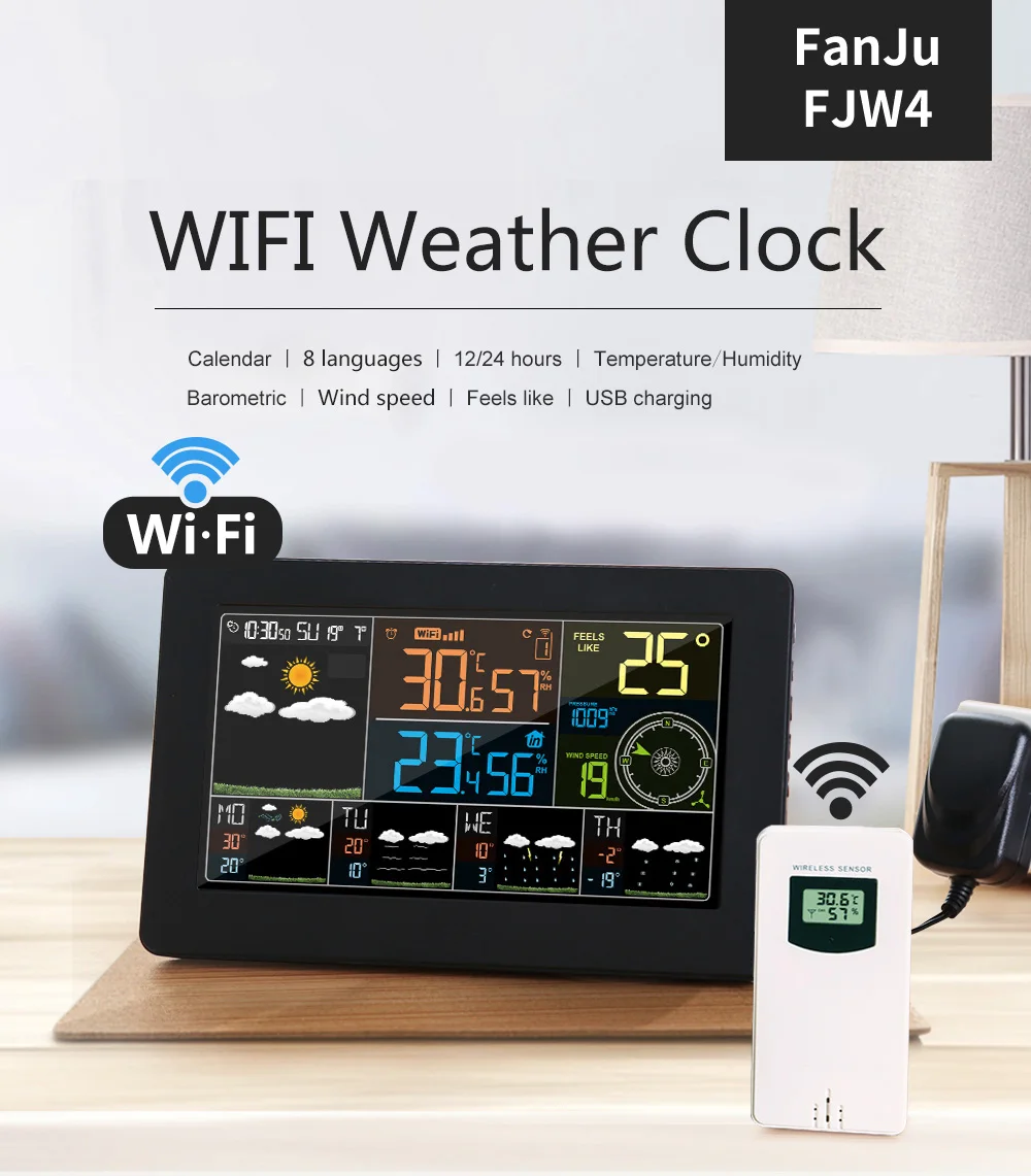 Цифровая настенная Метеостанция FanJu FJW4 с Wi-Fi, будильником, термометром, гигрометром, прогноз погоды в будущем, барометром, направлением ветра