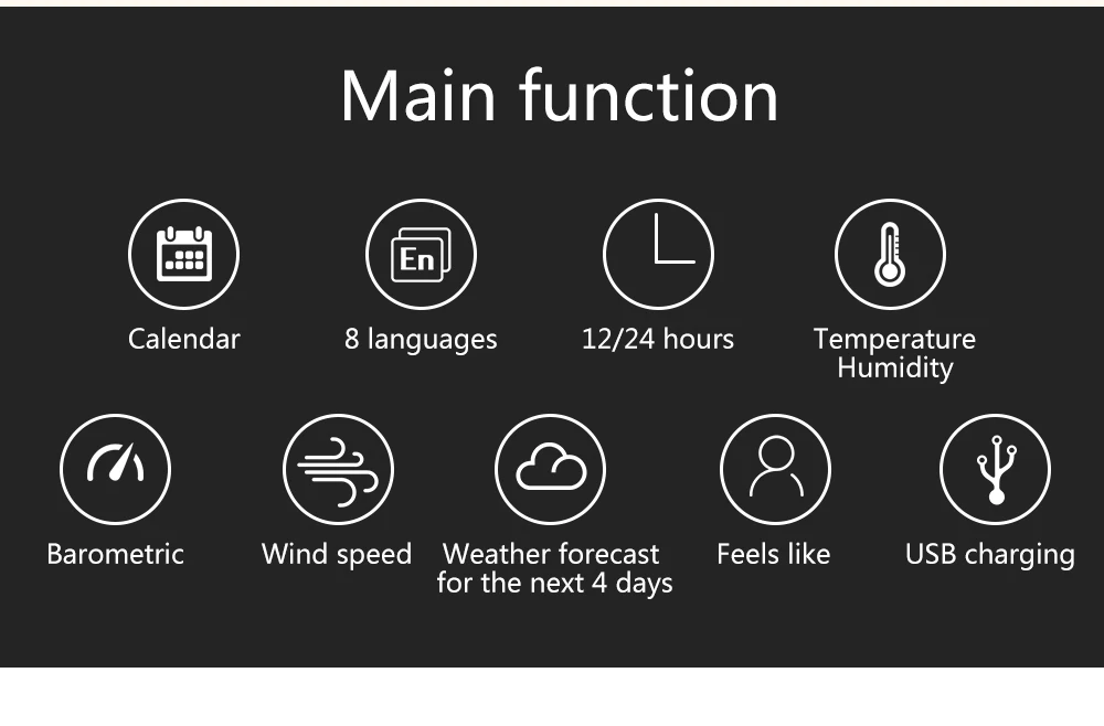 FeaturesWeather forecast, time, calendar, wind speed, snooze function, backlig