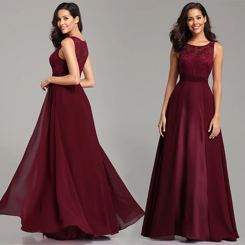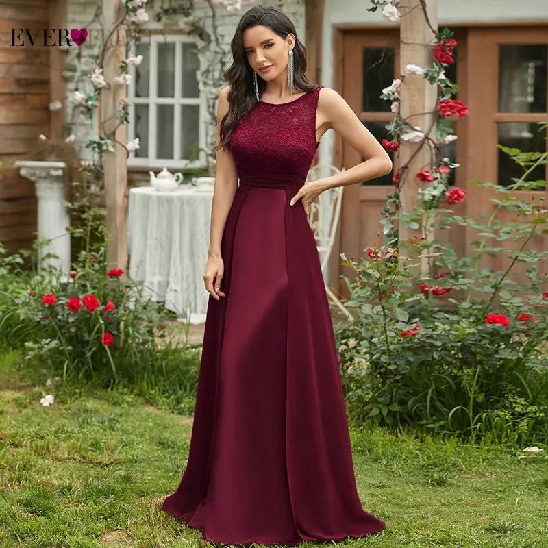 Женские длинные платья на выпускной Ever Pretty, вечерние шифоновые кружевные наряды бордового цвета, трапециевидного силуэта, без рукавов, с круглым вырезом, для вечеринки, EZ07695,лето 2019