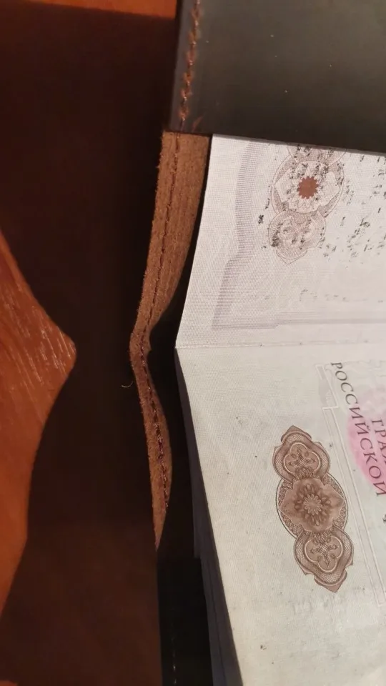 Обложка была отправлена быстро, дошла за пару недель, продавцу спасибо. Конечно, "кожа" прессованная, это явно не срез целого куска кожи животного. Наверняка, там ещё и разбодяжено "кожей молодого дерматина". Лицевая шлифованная сторона сильно царапается, буквально от ногтя. Но в любом случае, за эти деньги обложка достойная. Увесистая и выглядит солидно, уж получше моей старой задрипанной клеёнки))