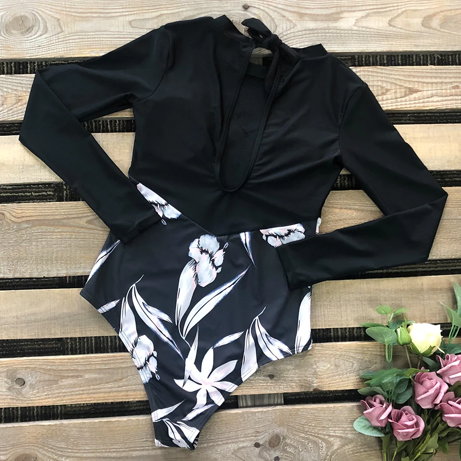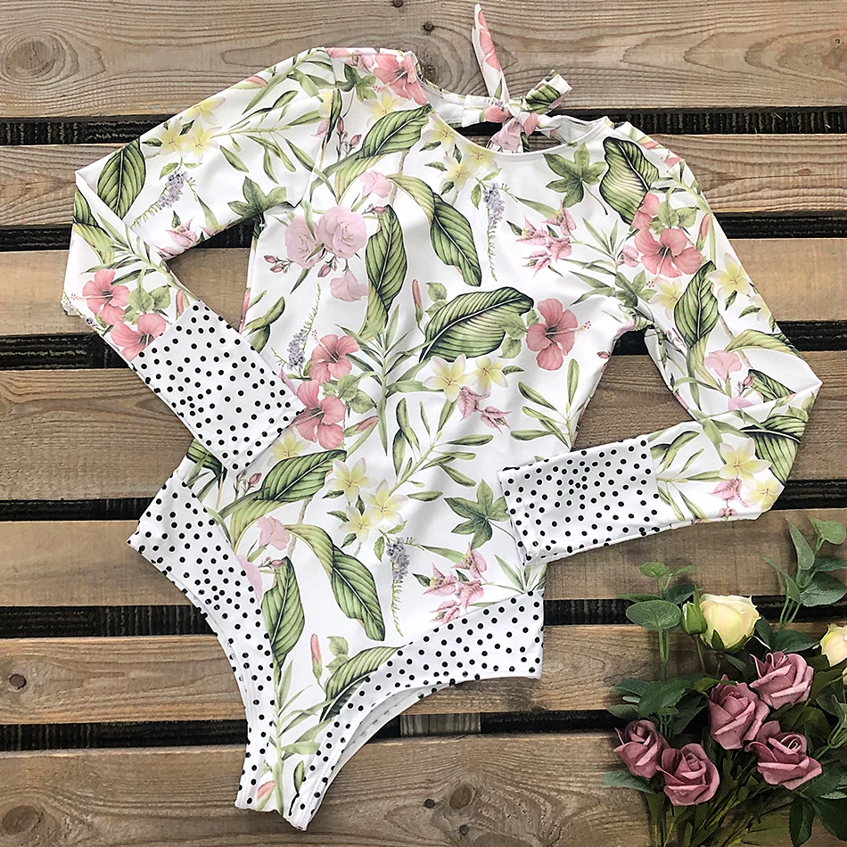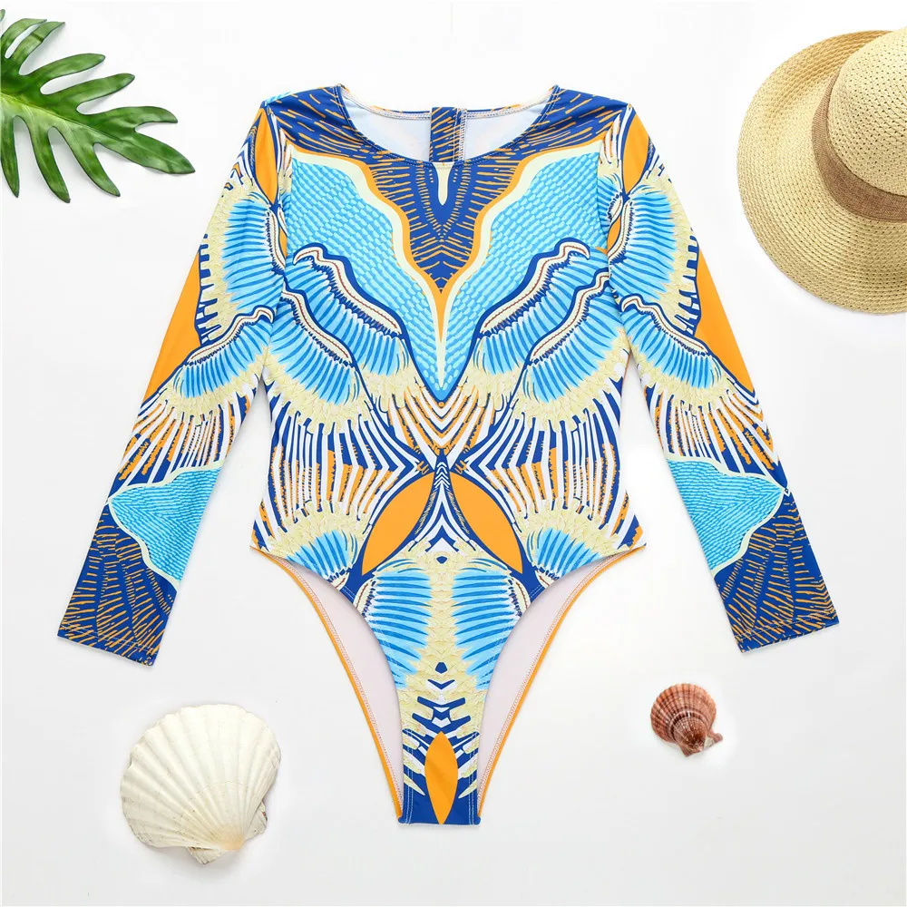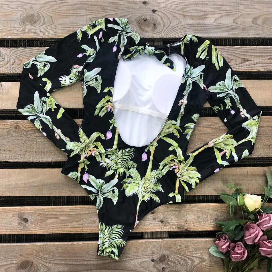 Женский Цельный купальник с длинными рукавами, Цветочные Купальники, монокини с тропическим принтом и открытой спиной, купальный костюм с фламинго, боди