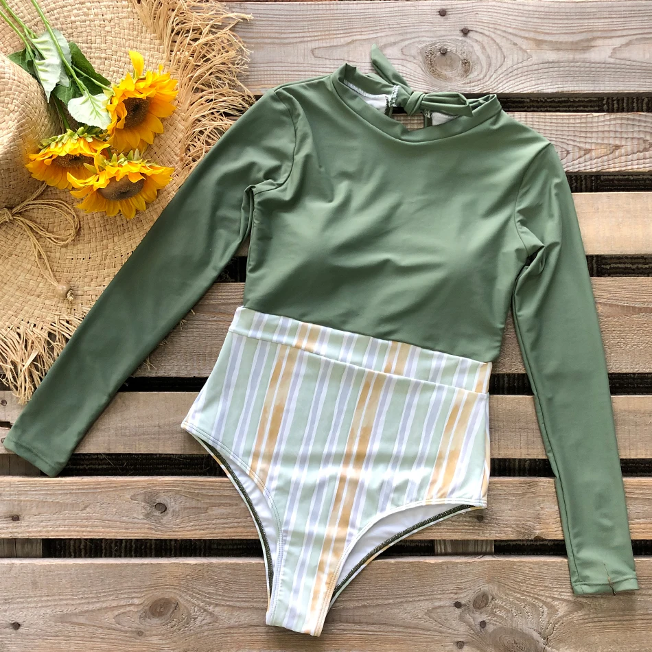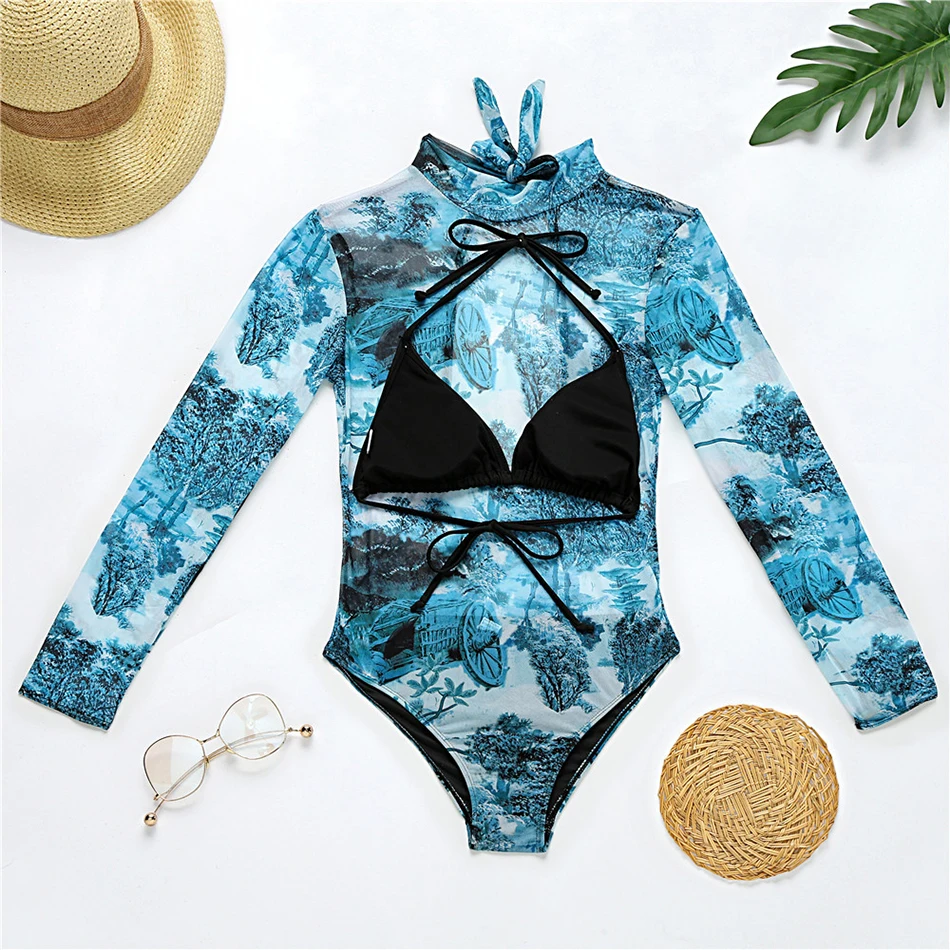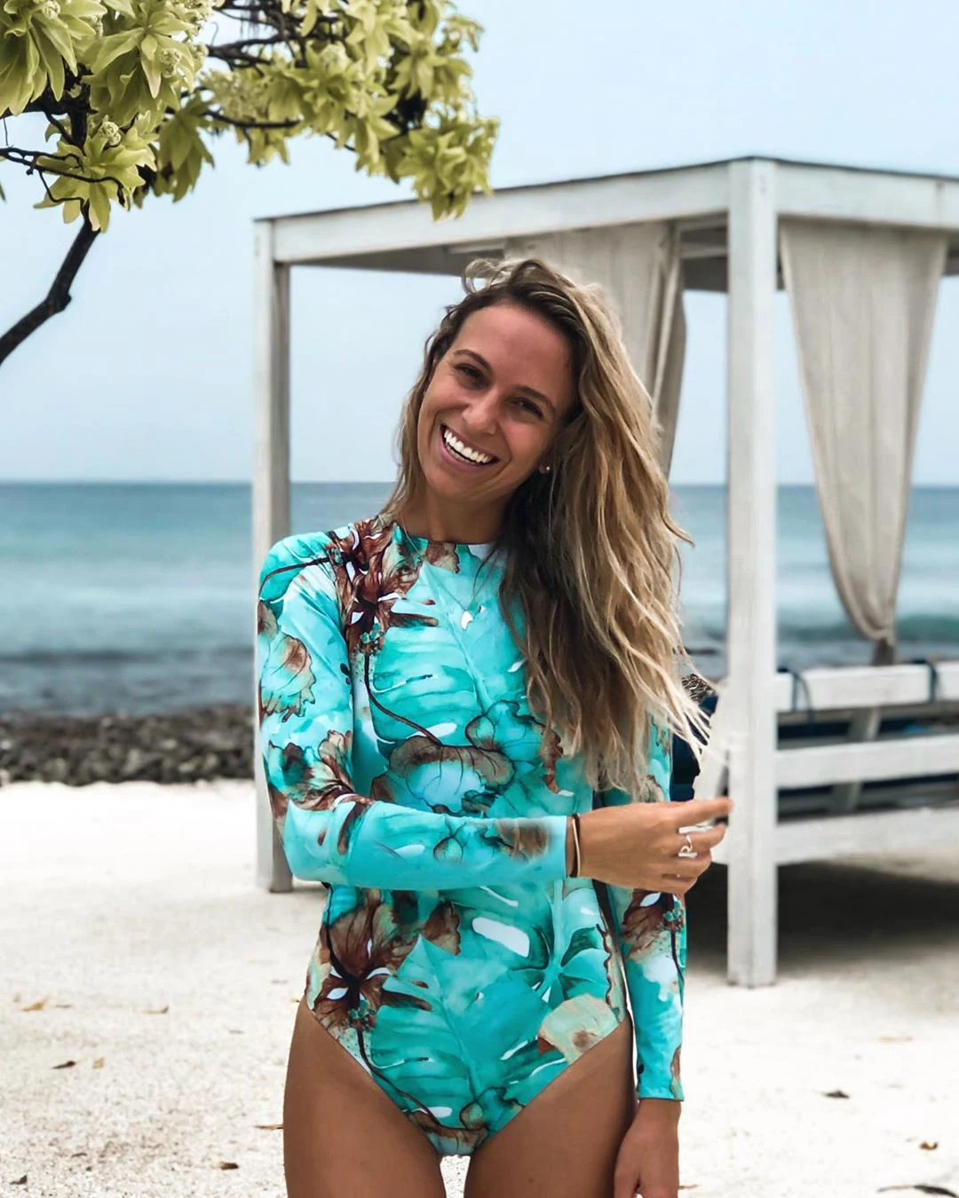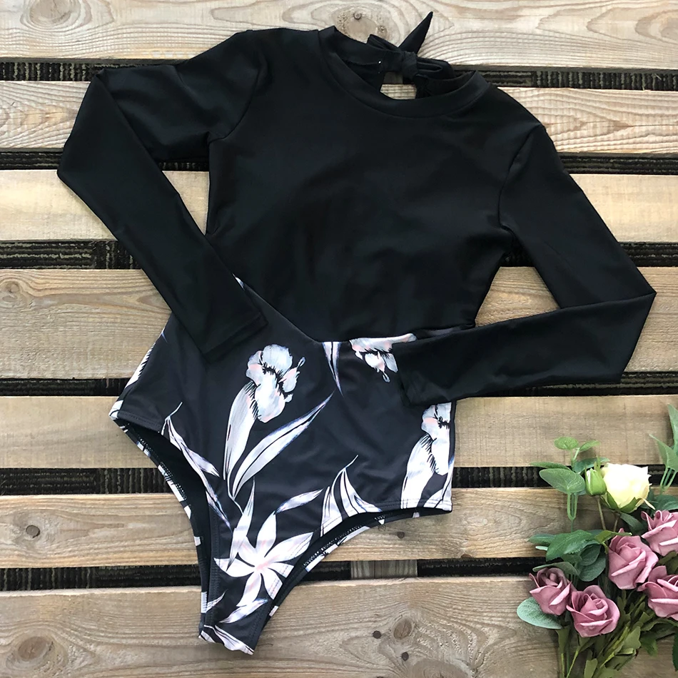 Женский Цельный купальник с длинными рукавами, Цветочные Купальники, монокини с тропическим принтом и открытой спиной, купальный костюм с фламинго, боди