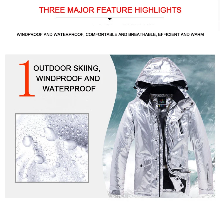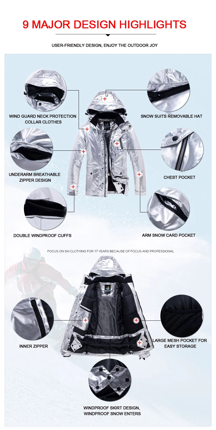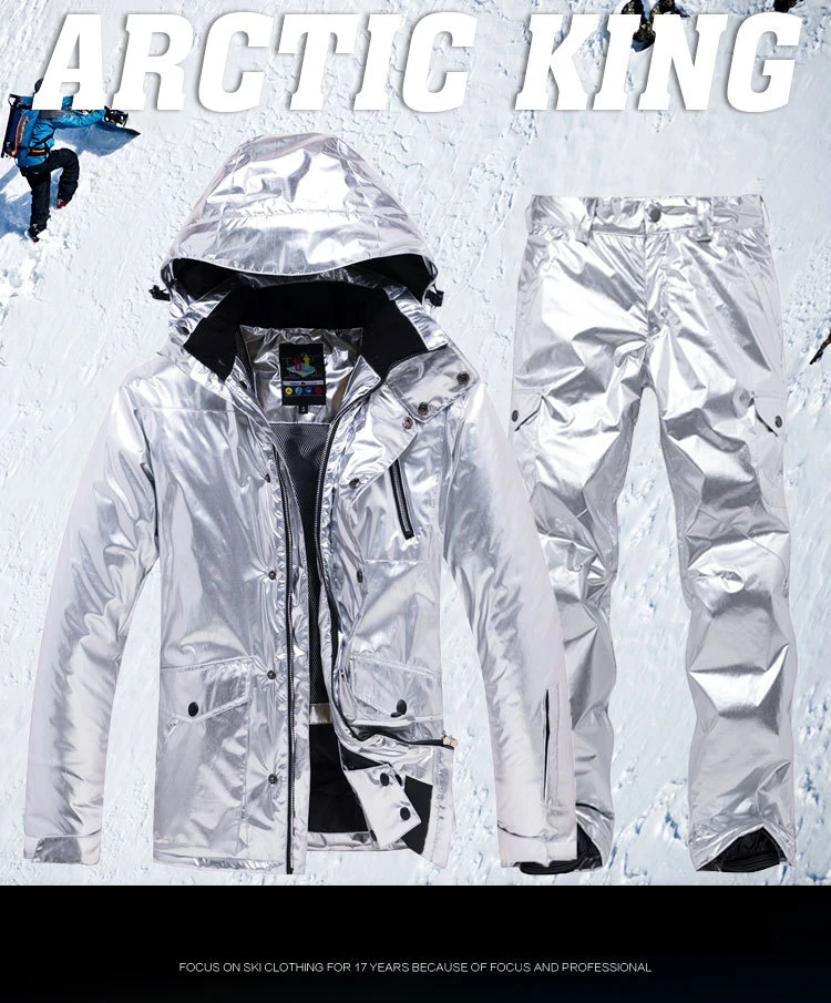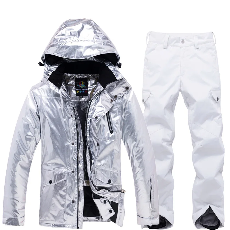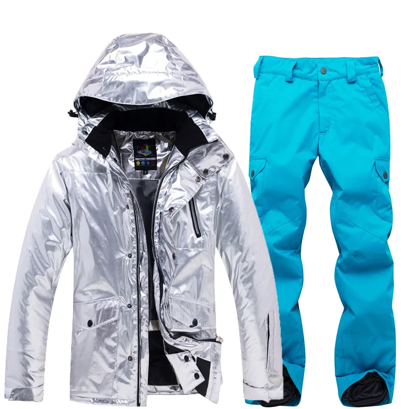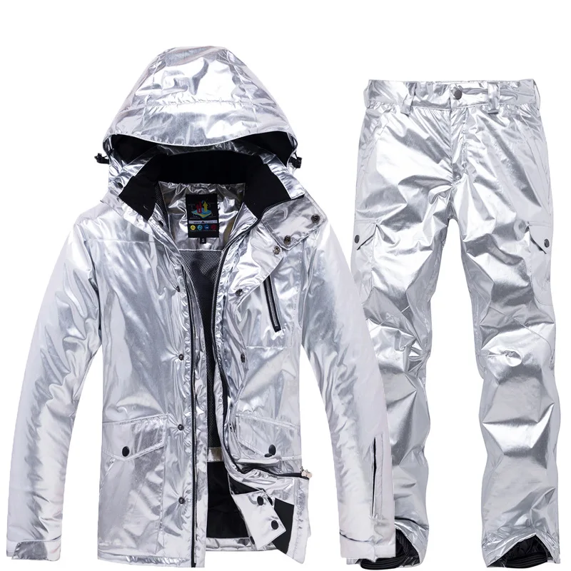 Блестящее серебро мужской женский лыжный костюм зимняя теплая водонепроницаемая ветрозащитная куртка для сноуборда брюки Лыжная одежда женские зимние костюмы