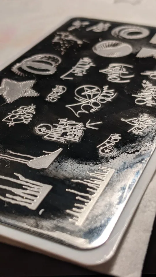 пластина дошла в пермский край быстро. но разочаровало то,что не все надписи отпечатывает. я пробовала разные штампы (3 разных,как мягких,так и жёстких) и разными лаками,толку ноль. вот именно "бомб" не отпечатывает криво.