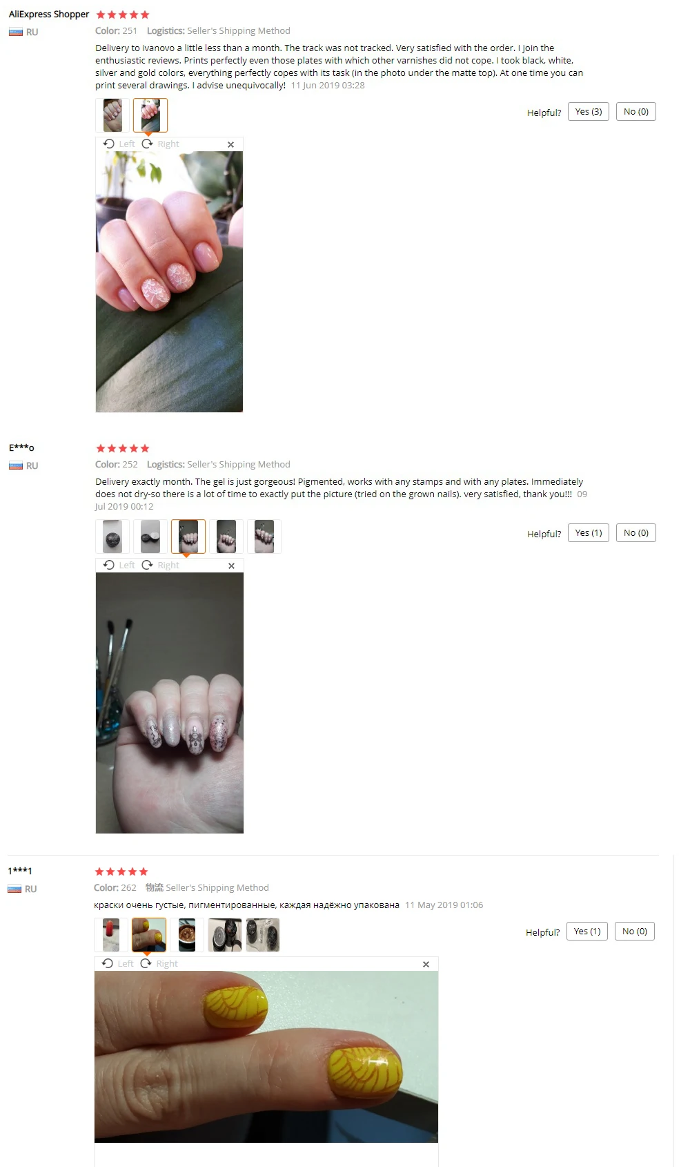Я заказал 3 геля трафаретов для примерки белого, черного и золотого цвета. Товары прибывают через месяц. Остались очень рады, что продукты отличного качества для штамповки для вашего дизайна ногтей. Печать хорошо светится, и вы также можете сделать два принта. Настоятельно рекомендую ordinerò, безусловно, другие цвета.