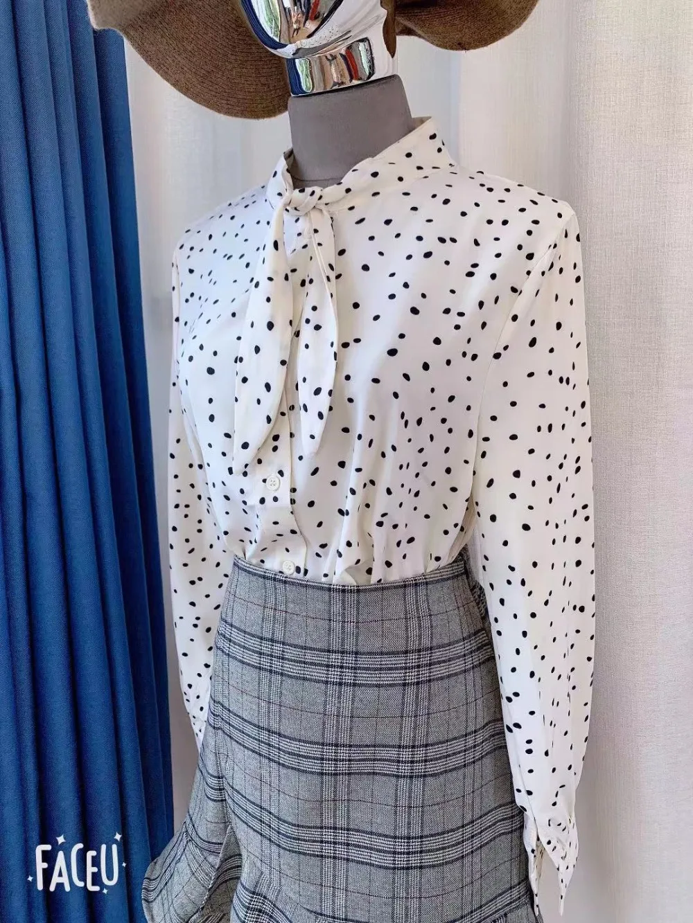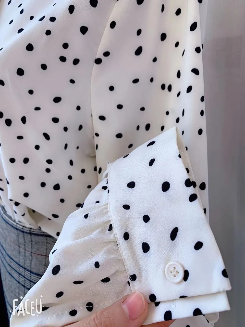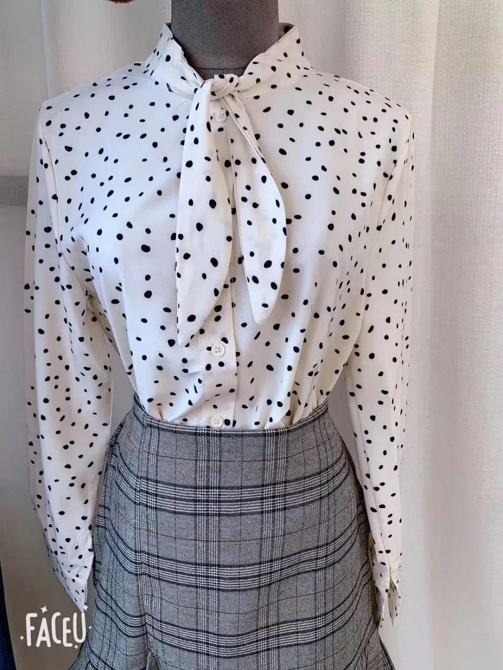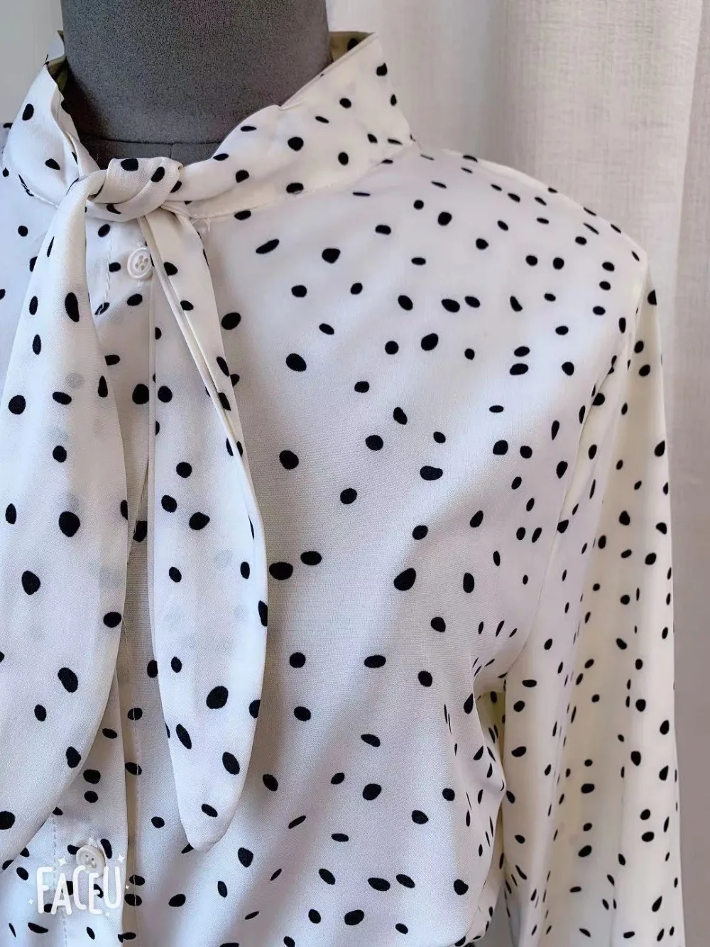 Очень красивая блузка, только точки на ней не белые, а бежевые. Но это ещё красивее! Пришло быстро