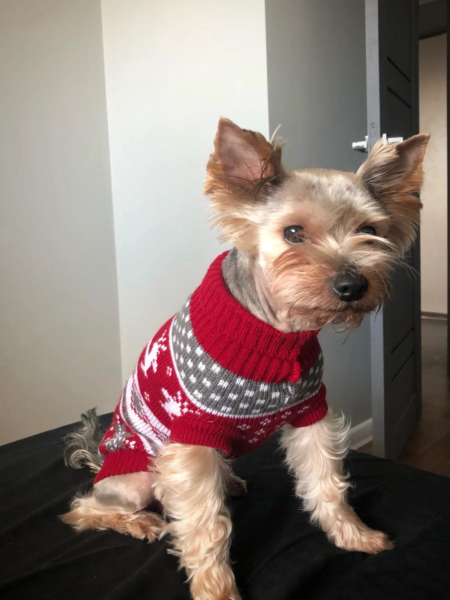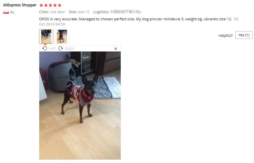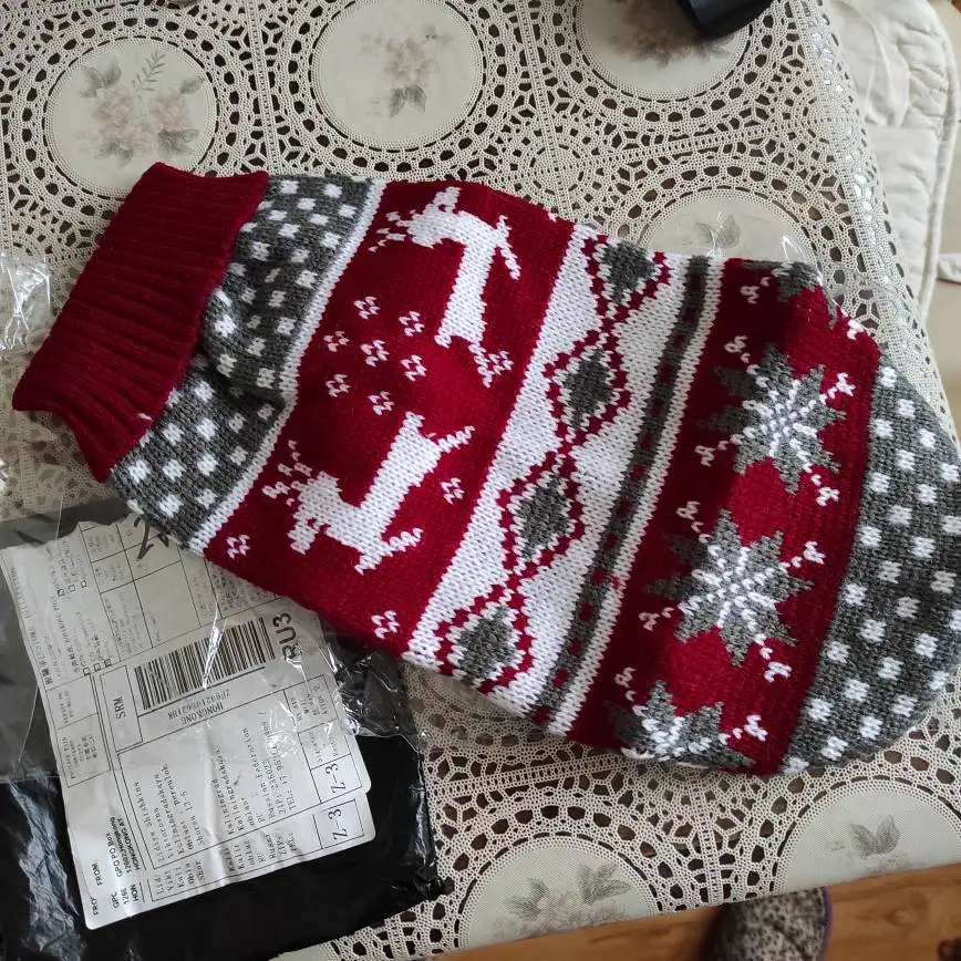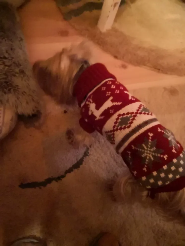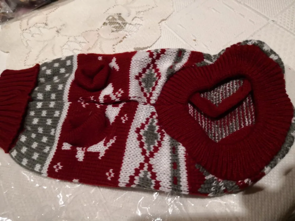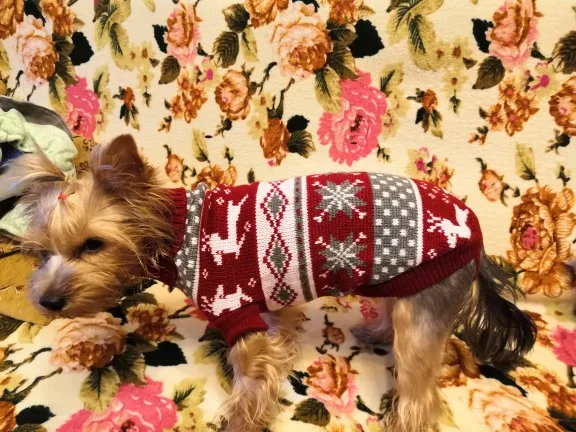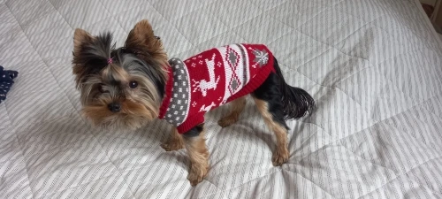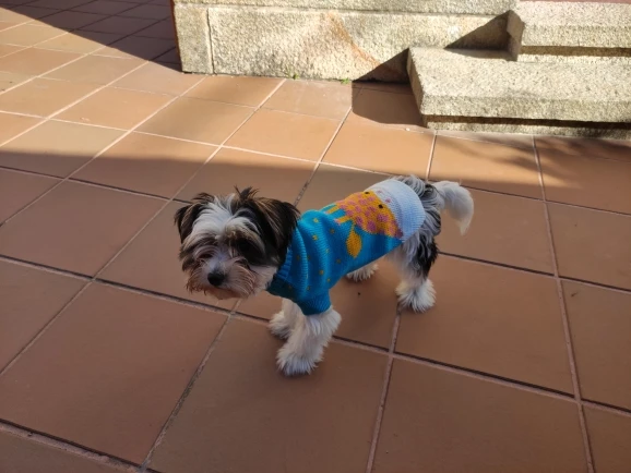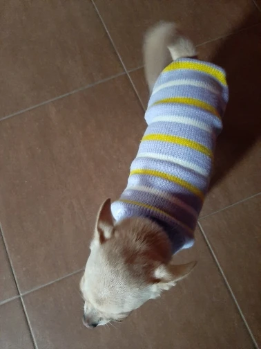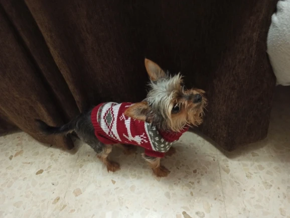 Perfecto! La talla corresponde para mi Yorkshire de 4.3kg, , Llegó en dos semanas, antes del tiempo previsto. Corté las tiras para las patas traseras, no son necesarias porque el suéter es ajustado. Excelente relación calidad/precio.