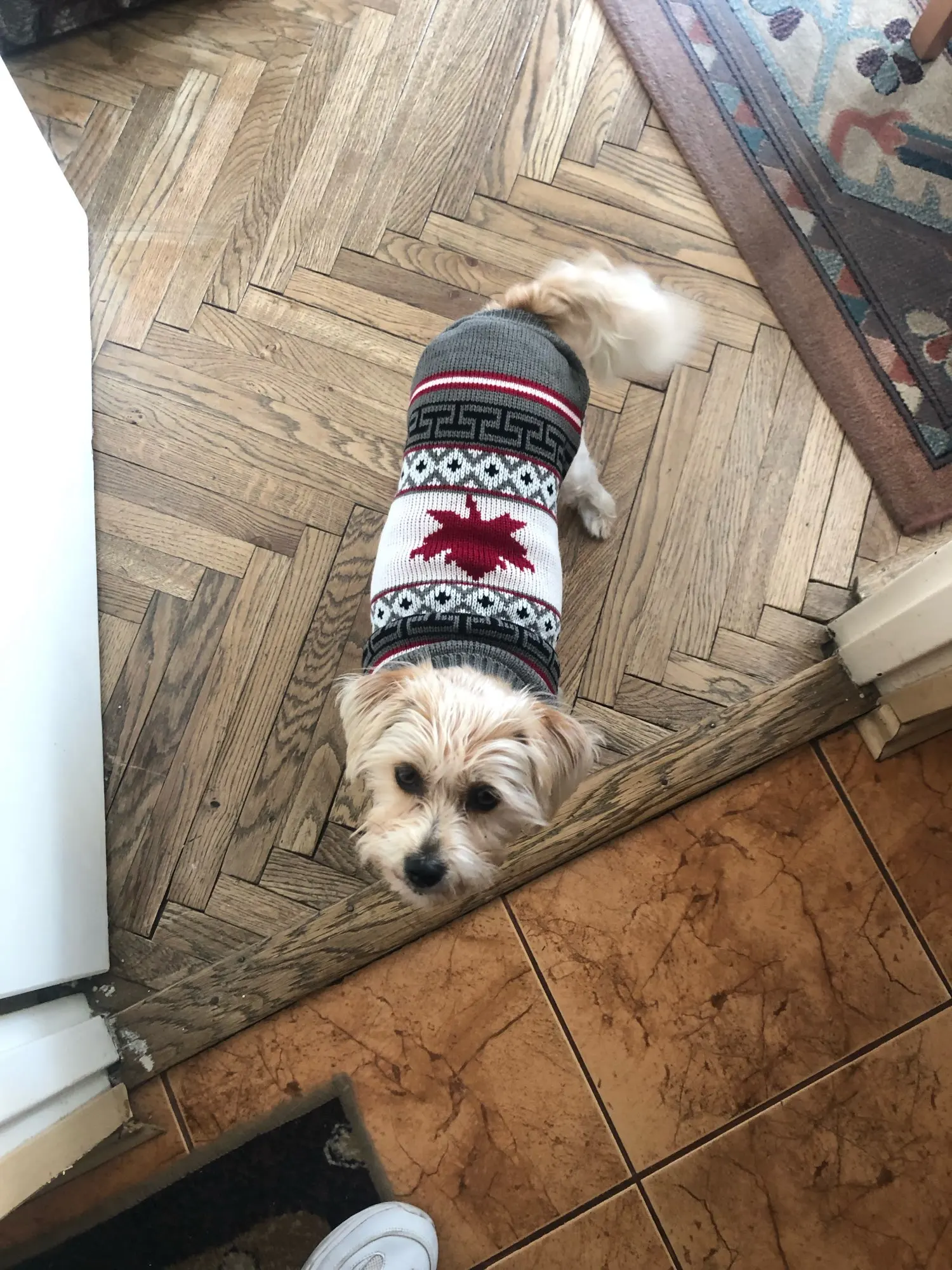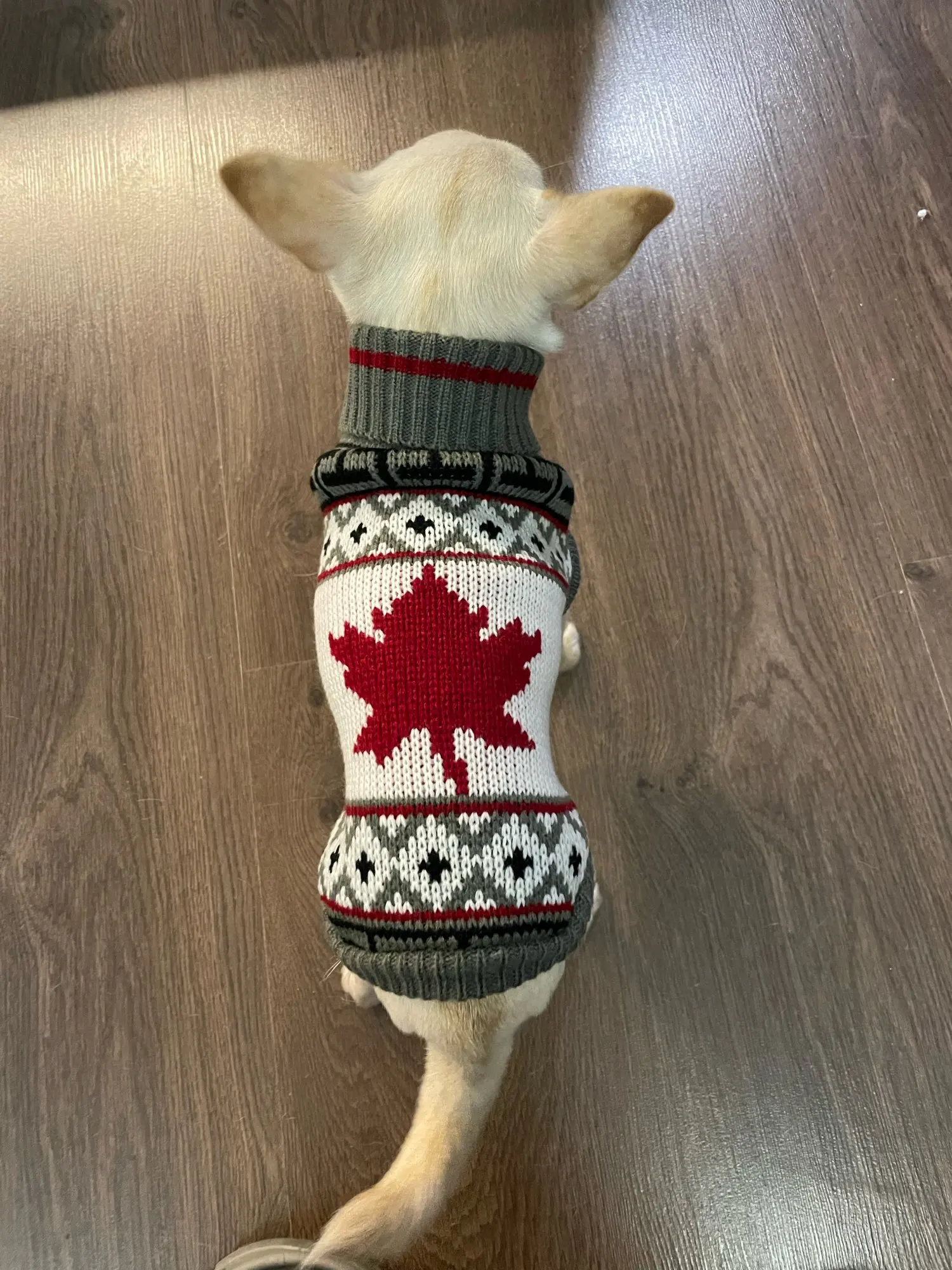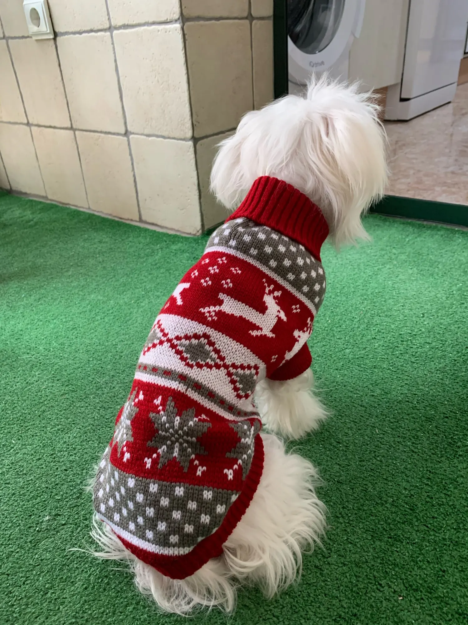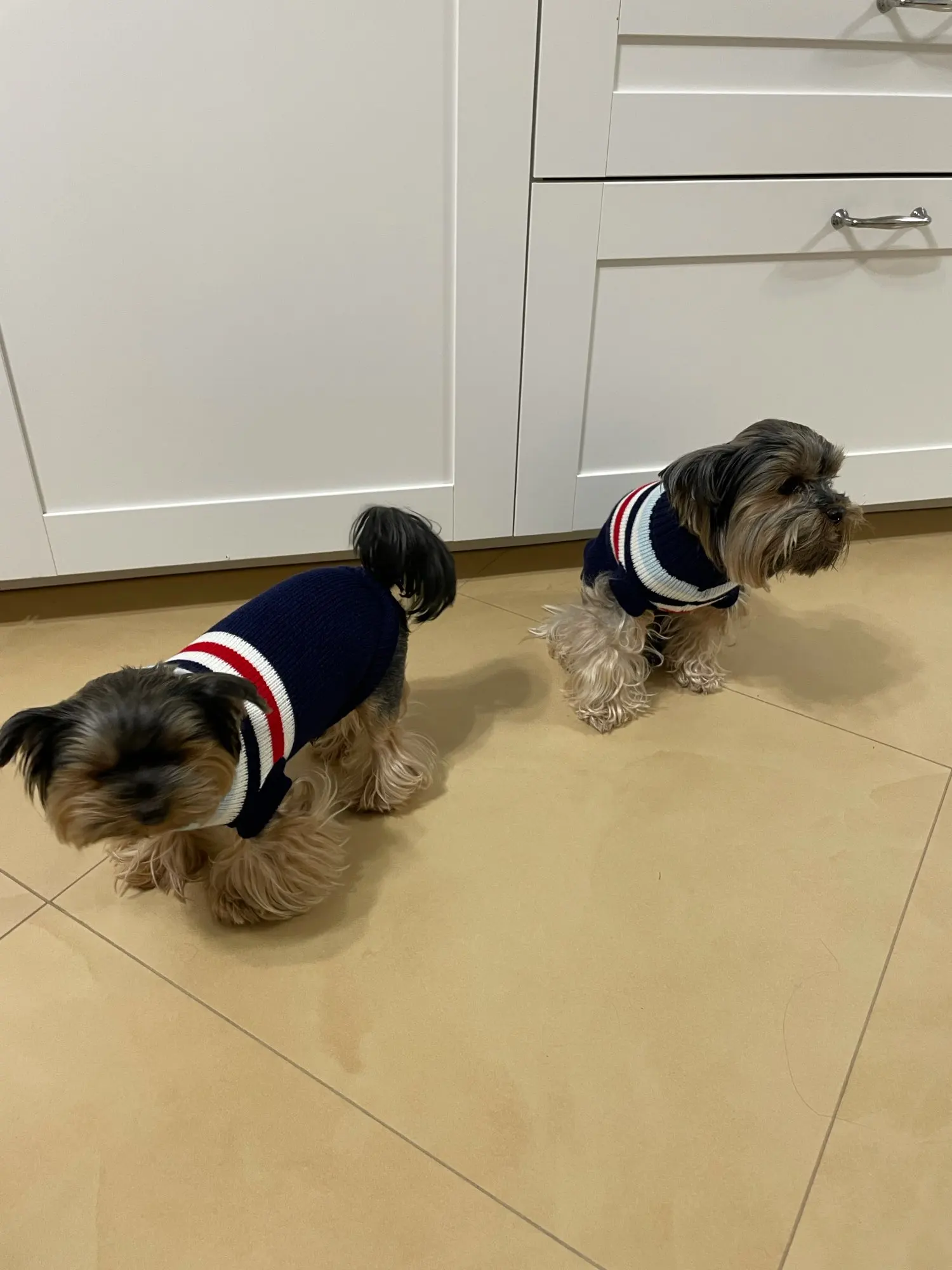Perfecto! La talla corresponde para mi Yorkshire de 4.3kg, , Llegó en dos semanas, antes del tiempo previsto. Corté las tiras para las patas traseras, no son necesarias porque el suéter es ajustado. Excelente relación calidad/precio.