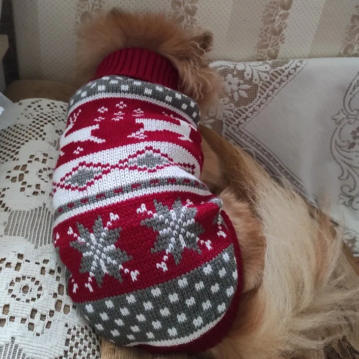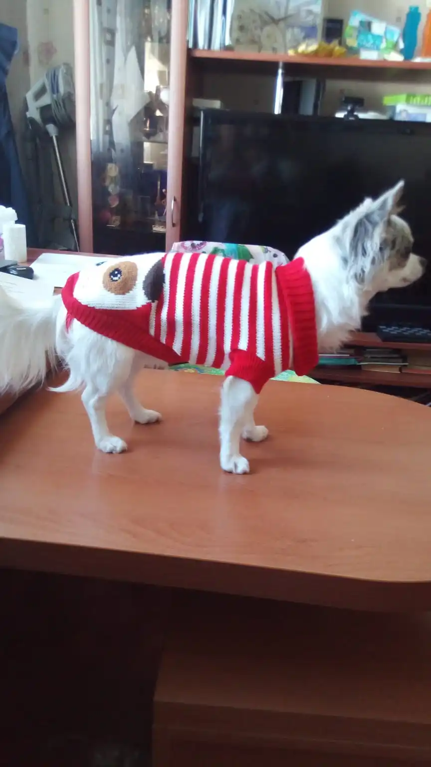 Очень хорошая кофточка, вязка не жидкая, цвета четкие, на ножки идут петельки. На мини ши-тцу 30 см спина заказала размер 10, оказалось впритык, на ножки петельки не оденешь. Будем носить без петелек, длина почти до хвостика.