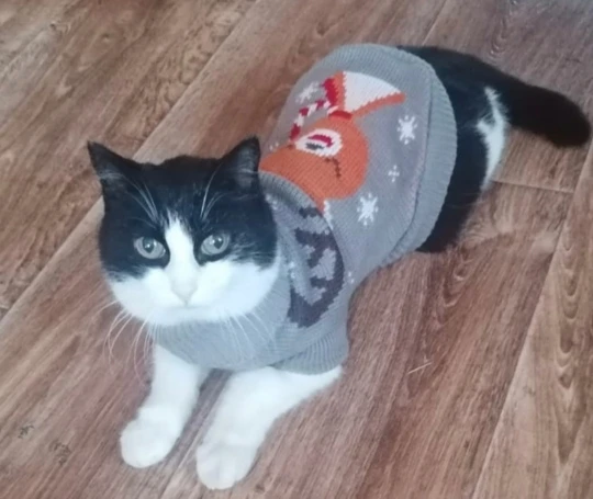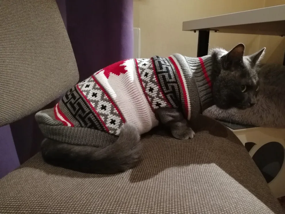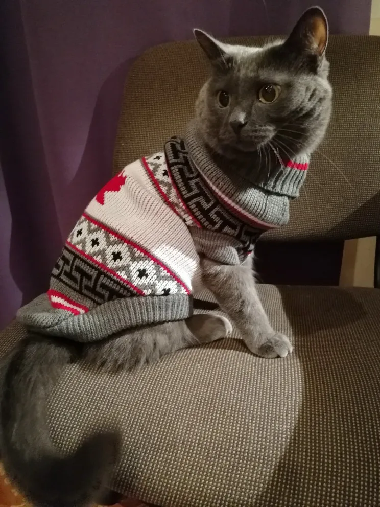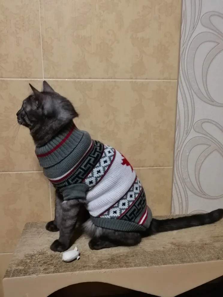 Свитер приятный на ощупь, рисунок классный, цвета яркие, оверлок и швы аккуратные. Из минусов - спереди толстый шов, может натирать кожу или повредить шерсть. Но я брала коты на фотосессию, так что думаю будет не критично.