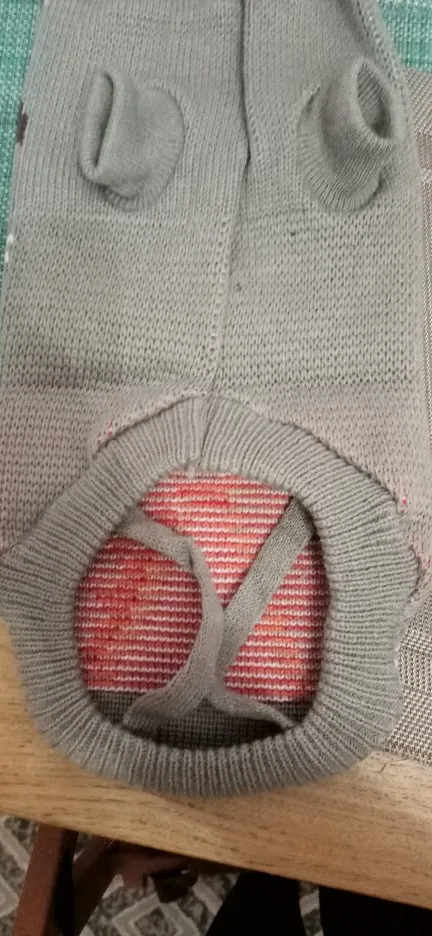 Супер свитер, держится на собаке отлично. Сзади имеются две верёвки, поэтому не спадает. Рекомендую.
