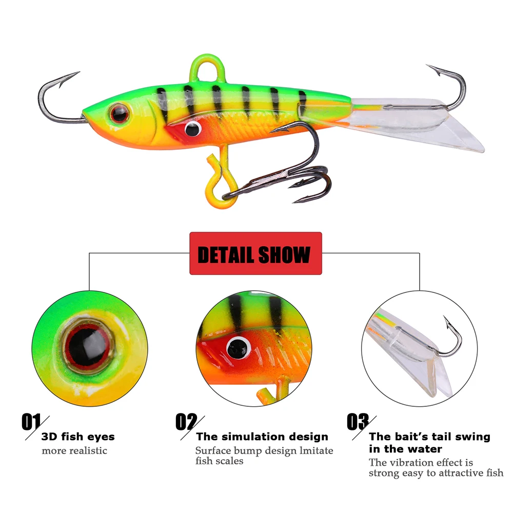 Вес: 7,5g 9,5g 10,5 г 16 18g Длина: 5 см, 6 см, 6 см 7,7 см 8,3 см Тип рыболовного крючка: #8 или 10 # Материал: привести посылка: 1 шт. приманка для ледовой рыбалки