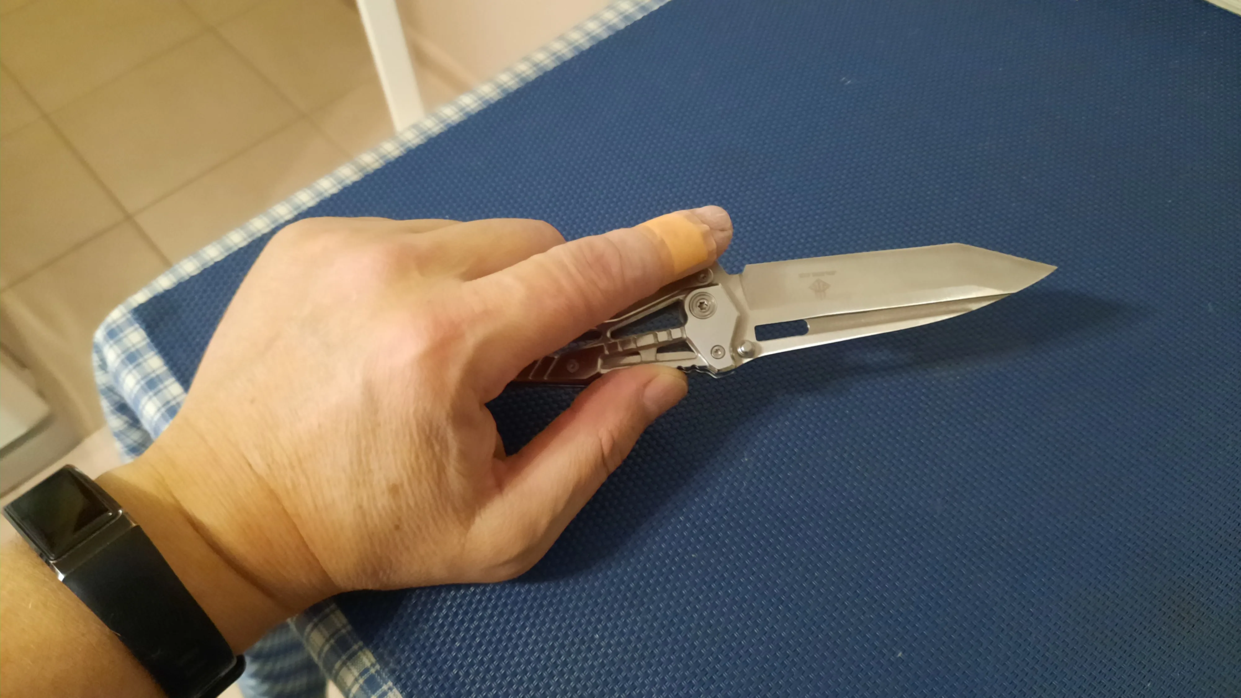 Лезвием можно бриться. В раскрытом положении фиксируется без люфтов. Но вот сам механизм неудобный. Одной рукой разложить или сложить нож не получится.