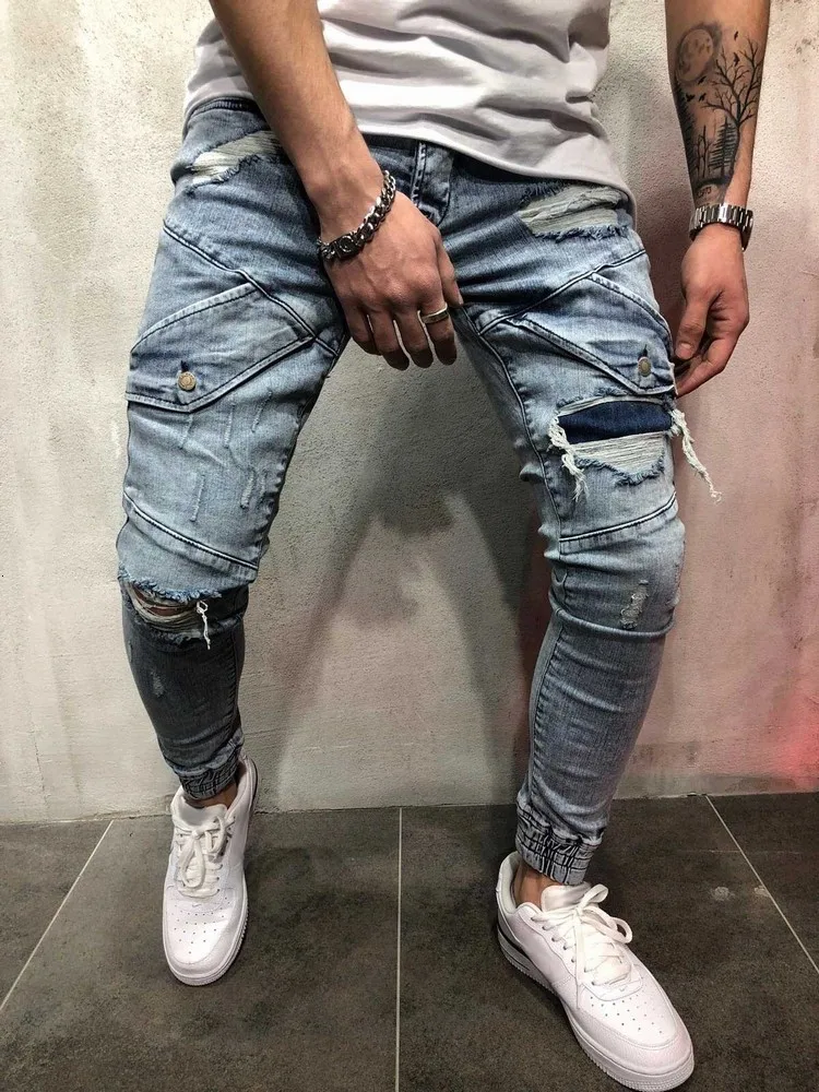 Мужские рваные джинсы в стиле хип-хоп Moomphya, синие Стрейчевые джинсы с потертостями для улицы