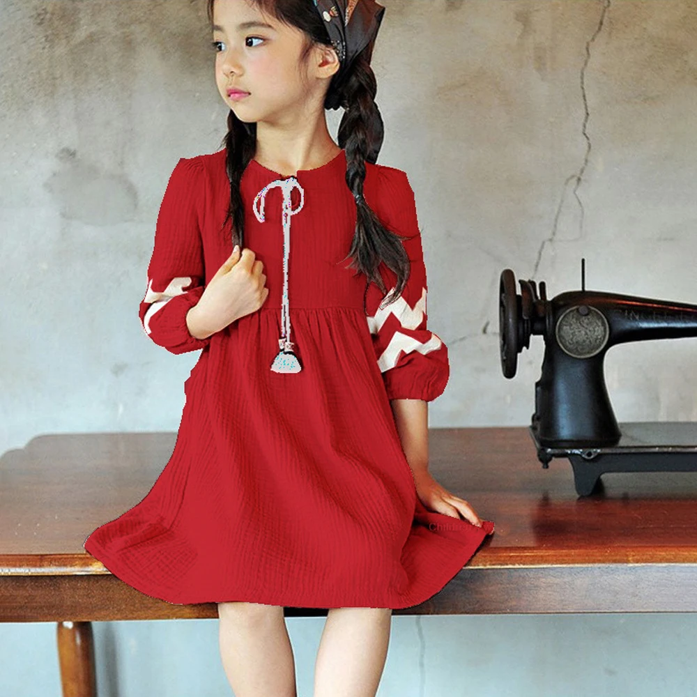 Осеннее платье для маленьких девочек свободные хлопковые льняные платья с рукавами-фонариками повседневная одежда принцессы с бантом для подростков на новый год