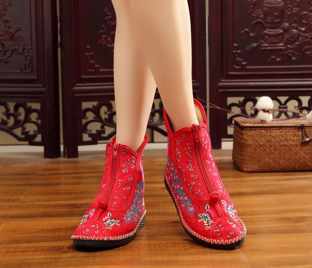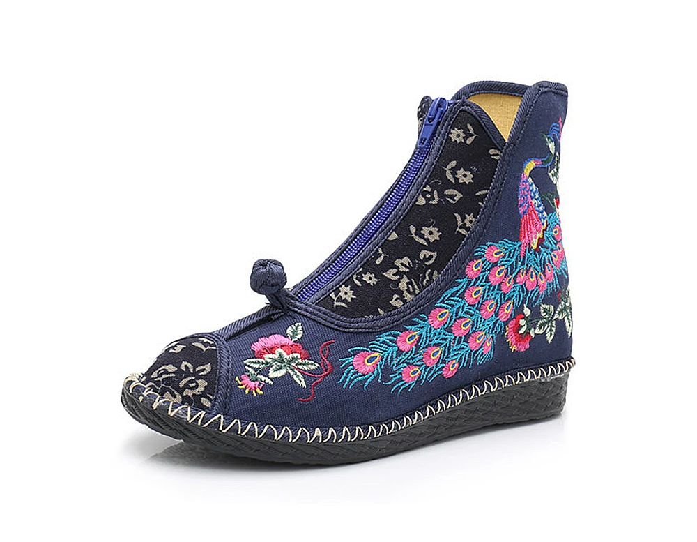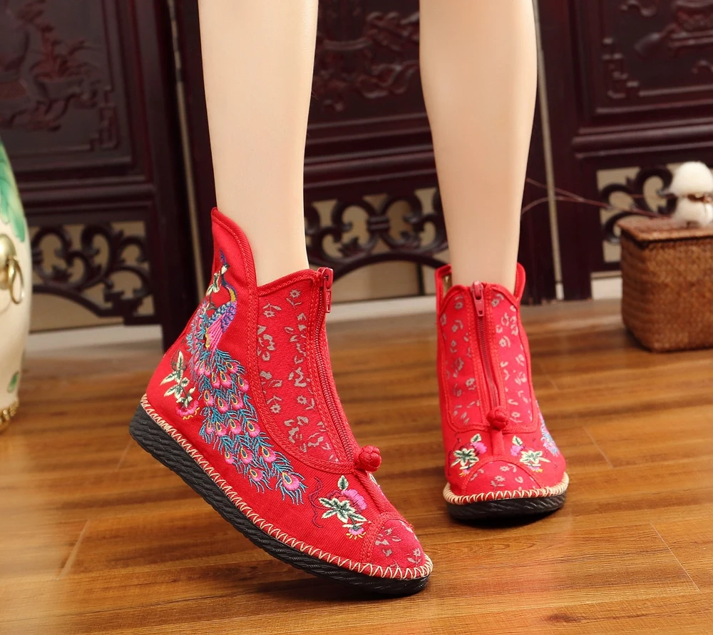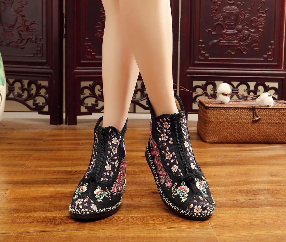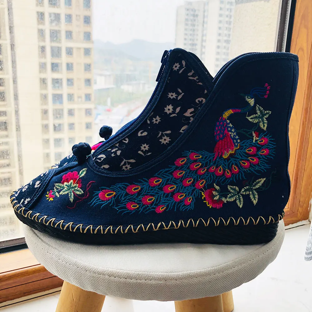 Ботинки женские Veowalk, парусиновые, на плоской подошве, с вышивкой павлина, винтажные хлопковые ботинки с китайской вышивкой, на молнии спереди