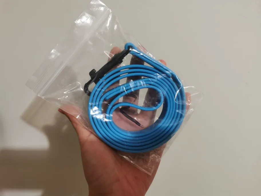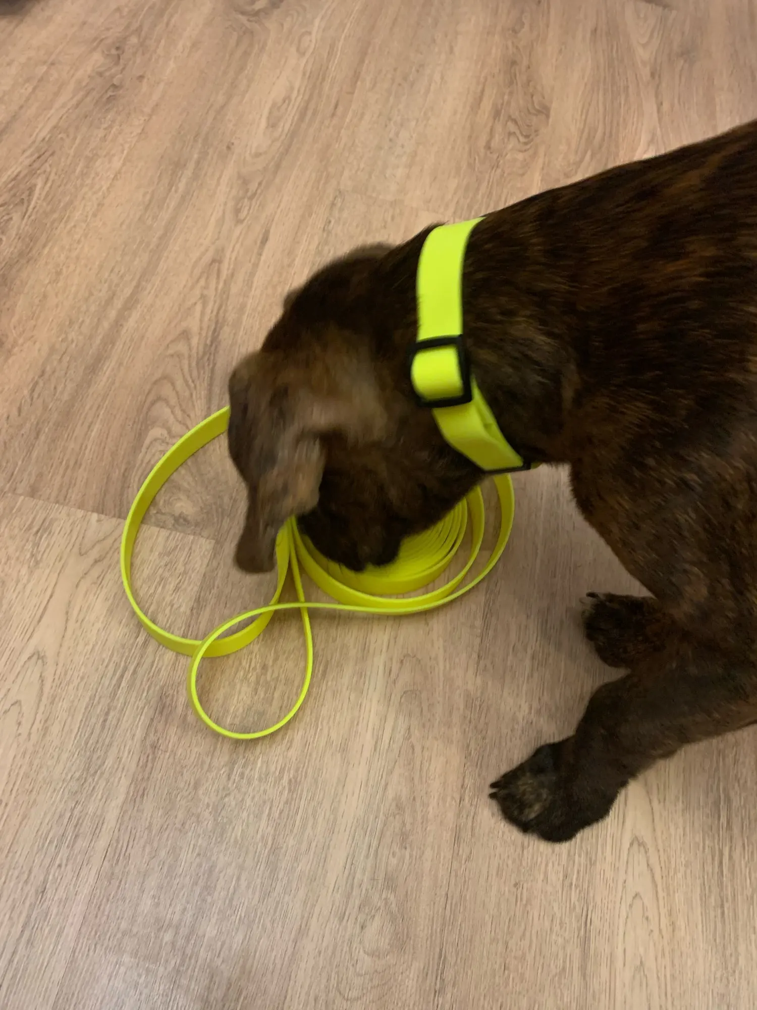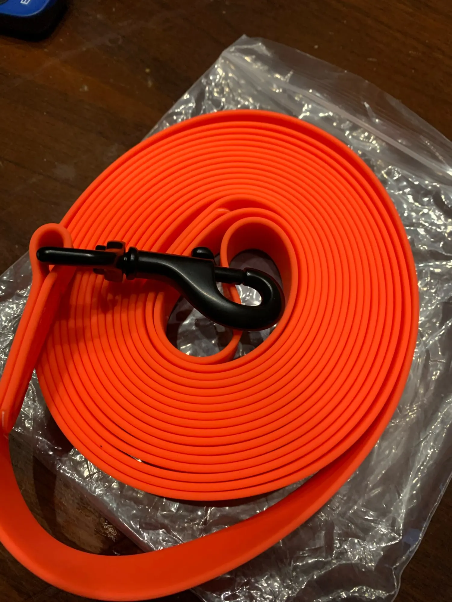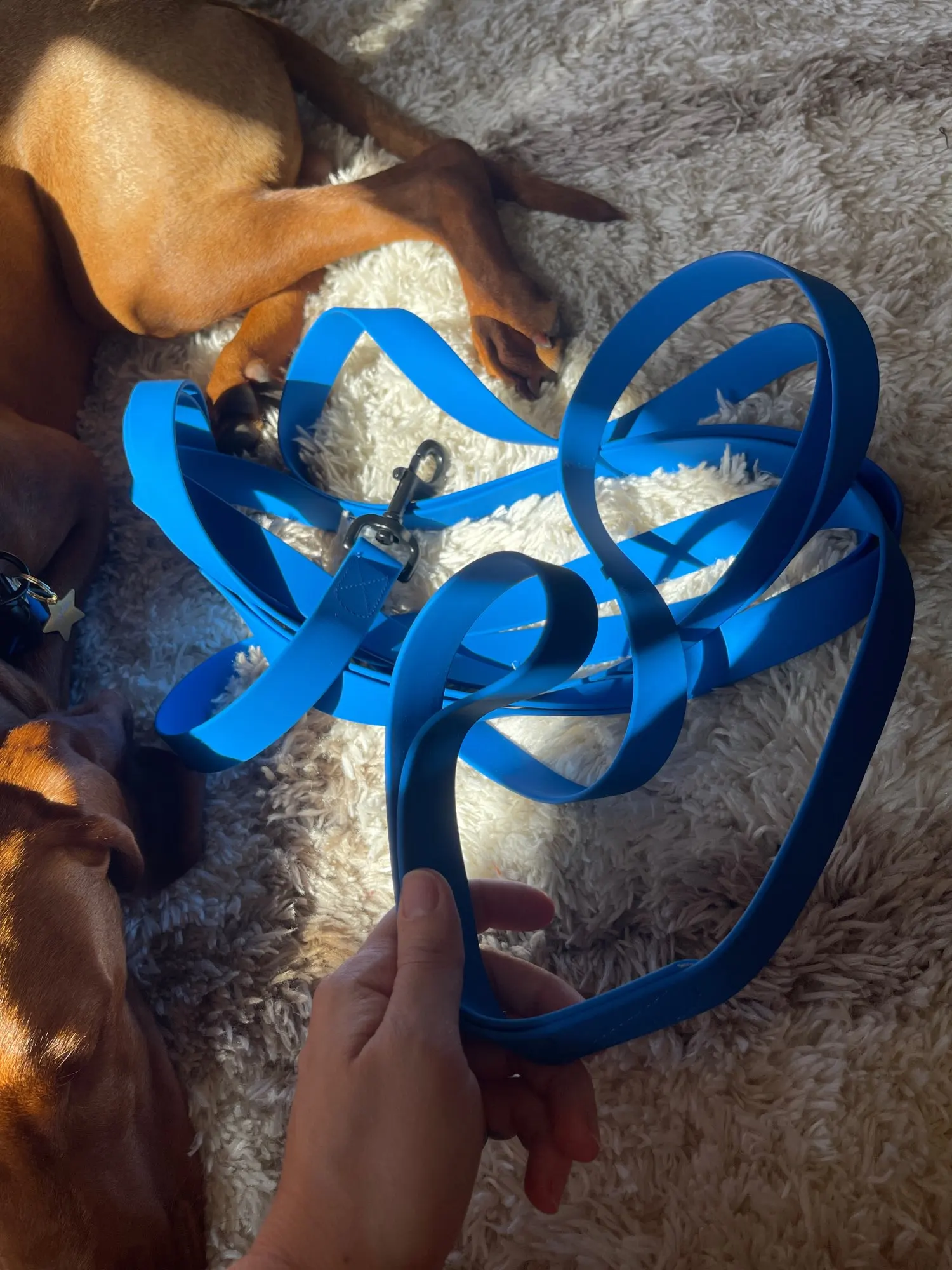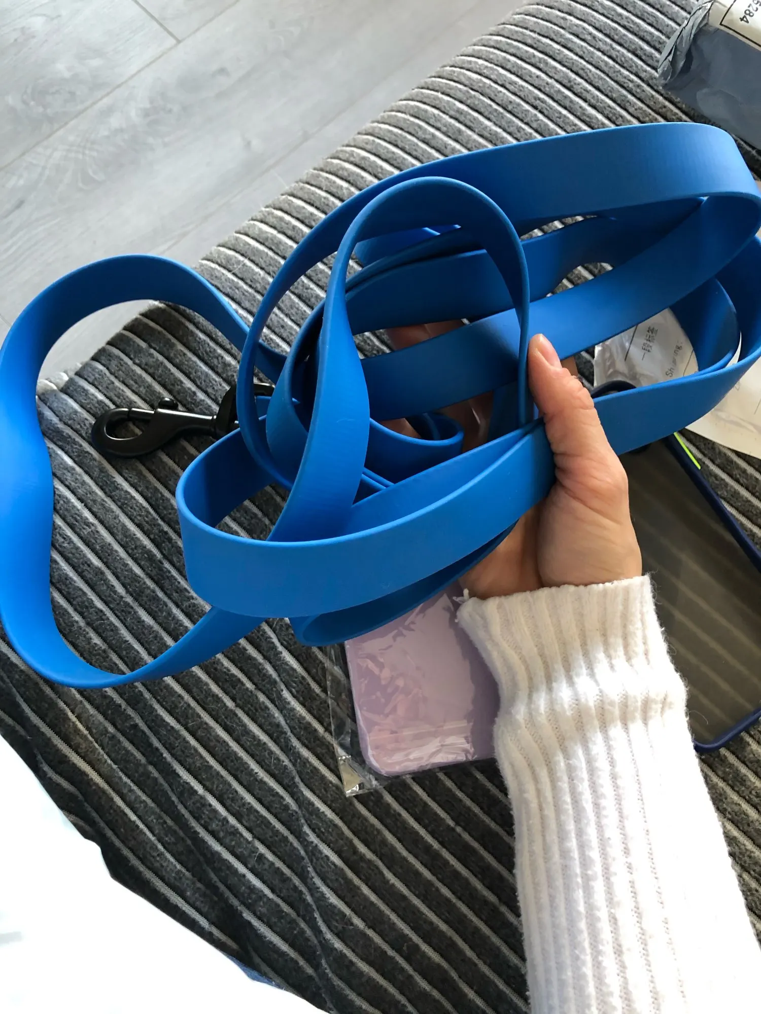 Поводок отличный. Приятный в руке, выдерживает хороший рывок, но мне 5м оказался большим и тяжелым. Моется очень легко, подбирали к ошейнику того же цвета.