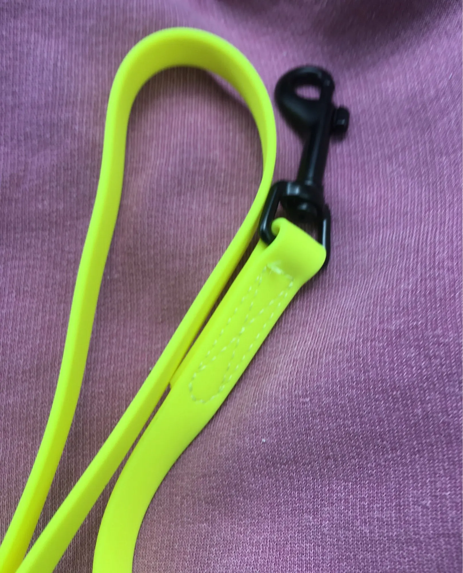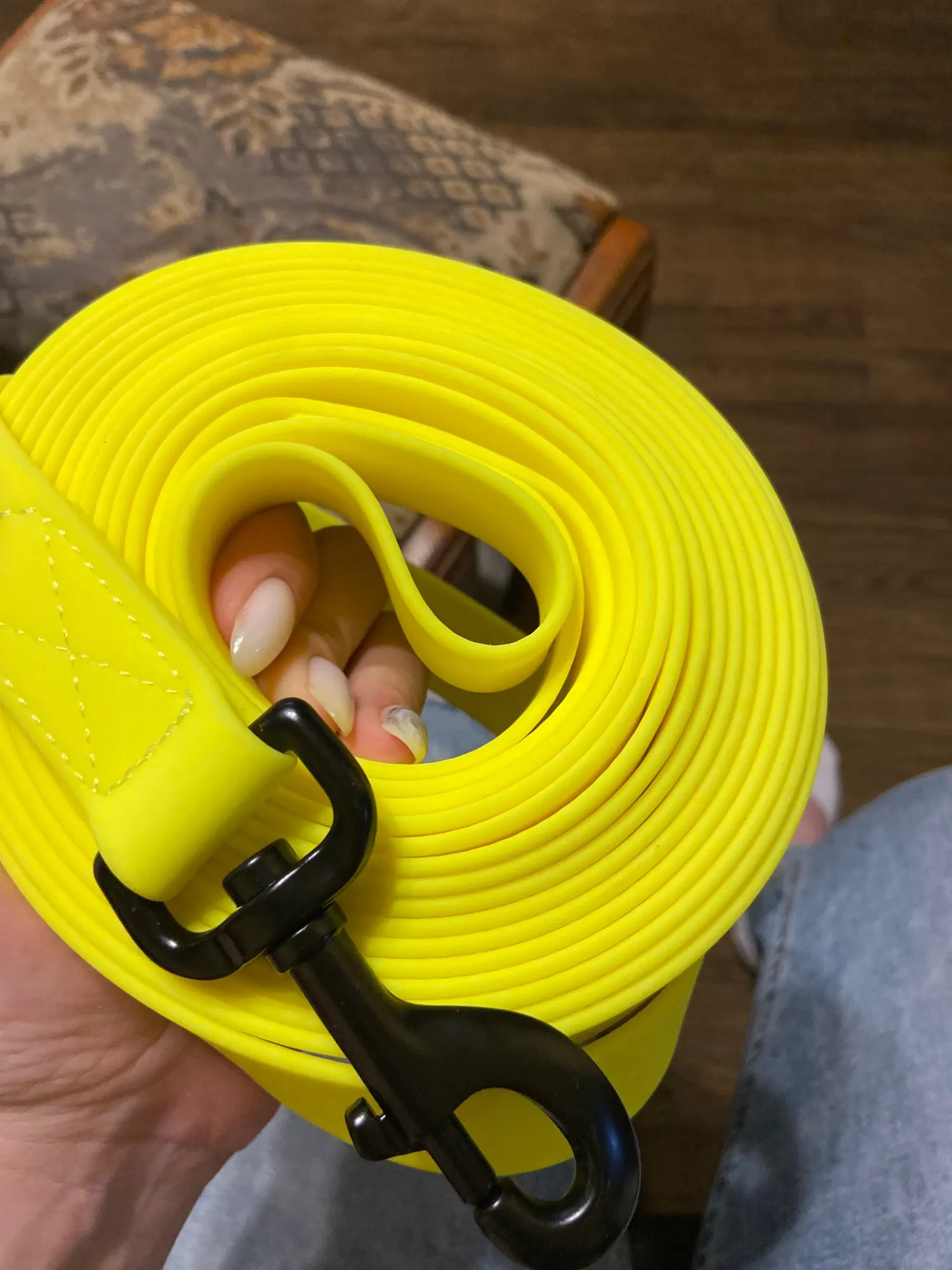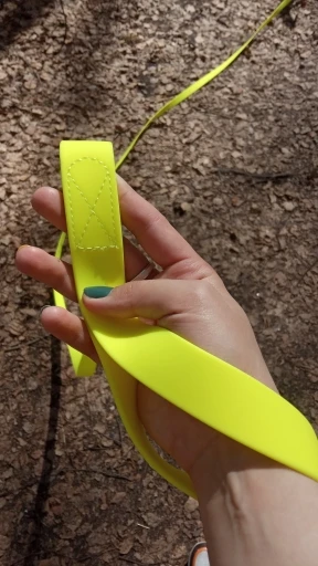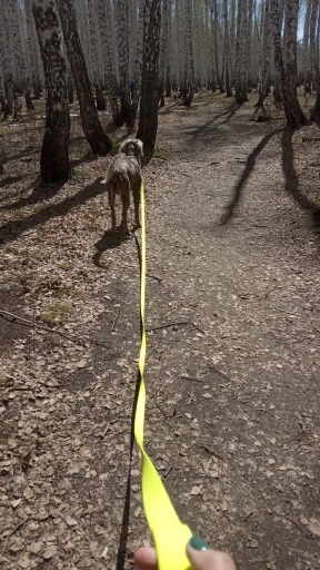 Заказывала поводок 5м в начале апреля - пришел прямиком к майским праздникам. Очень приятный на ощупь и мягкий, не слишком тяжёлый, материал неоново-желтого цвета (на солнце, как мне кажется, отливает зелёным). У меня дш вейм, для него такие размеры и ширина самое то. Для мелкашей не подойдёт. Брала такой поводок для отработки послушания на расстоянии и для путешествий. Довольна! Рекомендую!