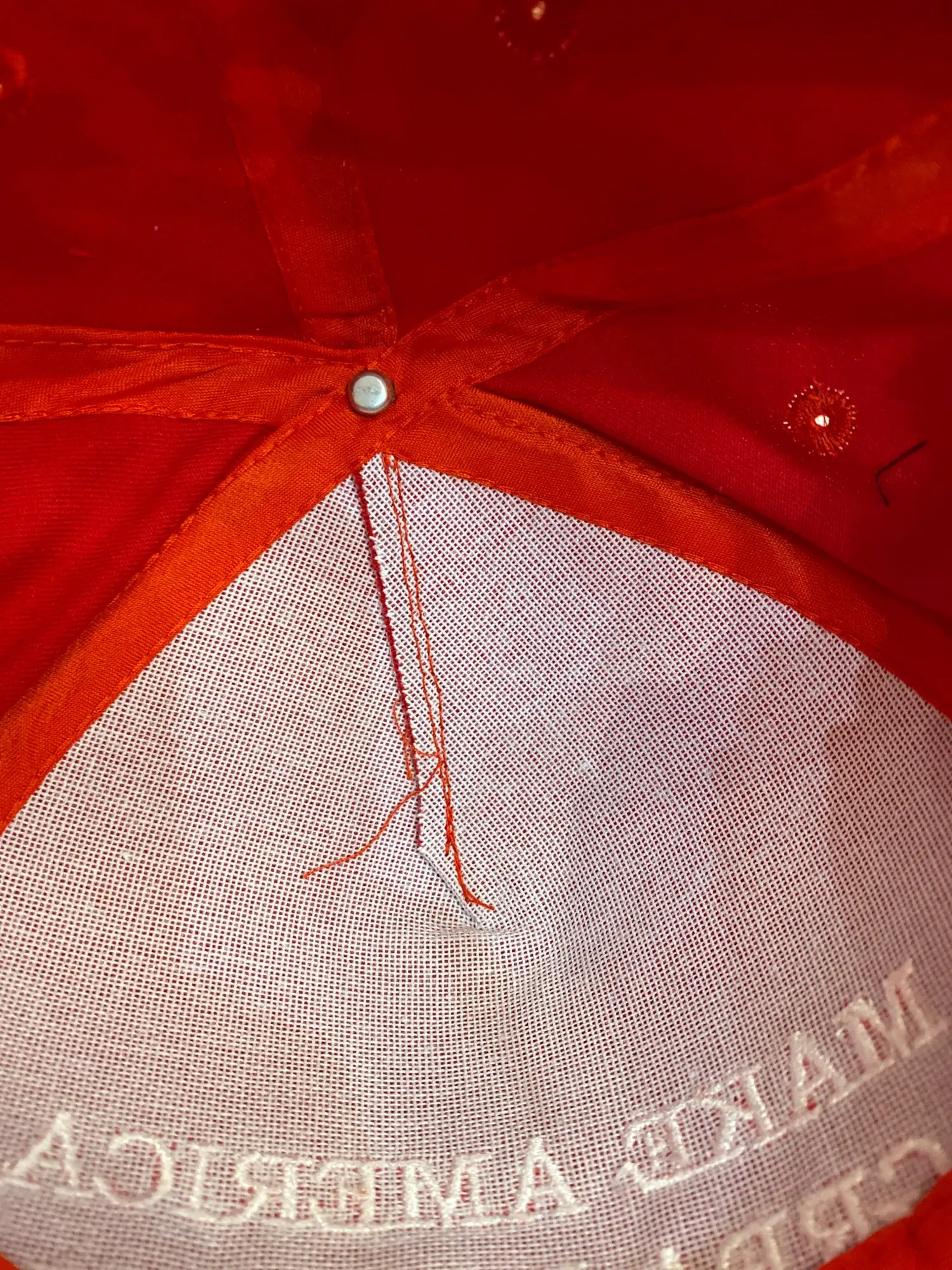 Это не так хорошо, как на картинке... Но Много стежков нет, американский флаг кажется немного кривым, плохой контроль качества на заводе, я думаю... Я честно думаю, что лучше купить настоящую шляпу маги, а не эти поддельные фальшивые.