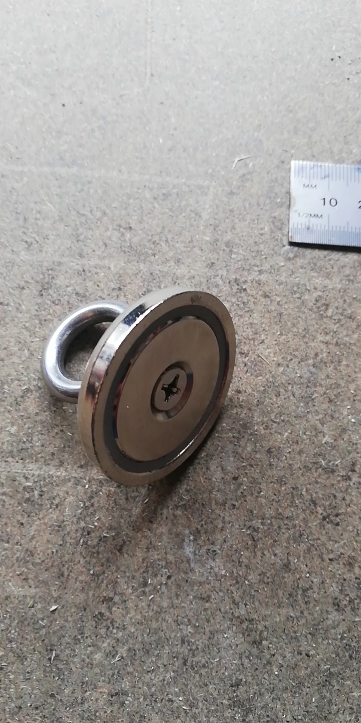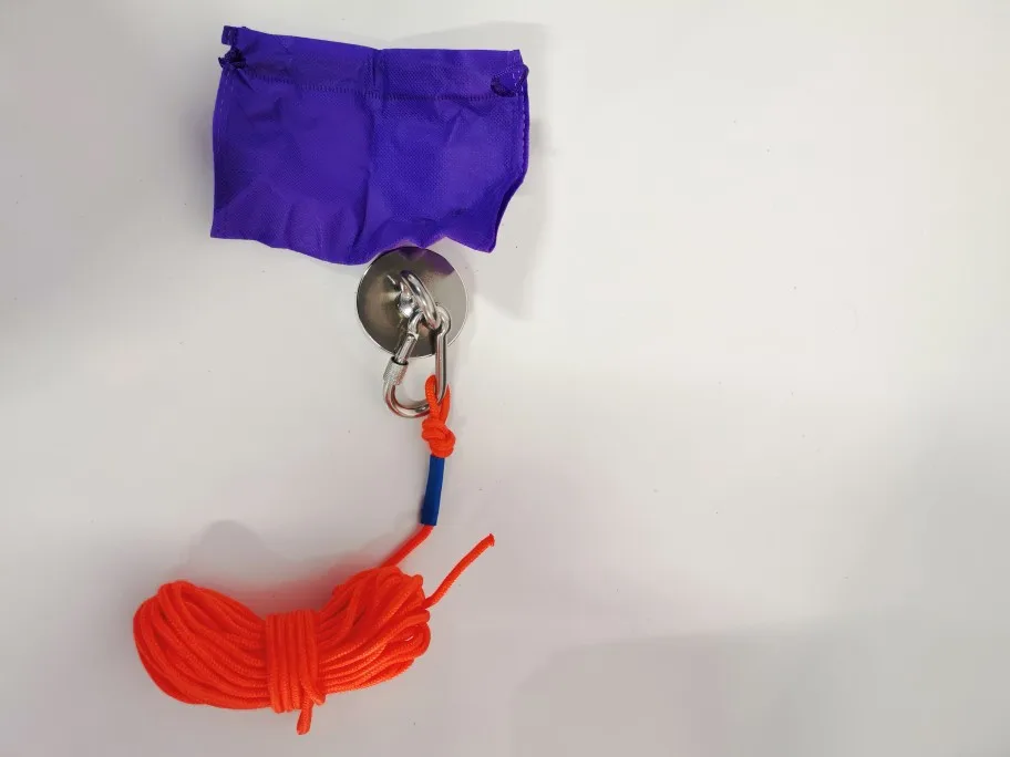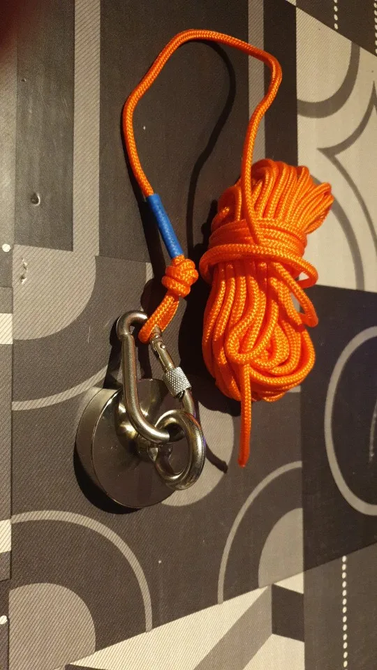 обычный магнит, чуть сильнее чем обычный. верёвка и карабин в комплекте чисто для чистки бассейна или фонтана от монеток. на большее он увы не способен