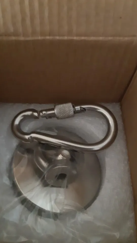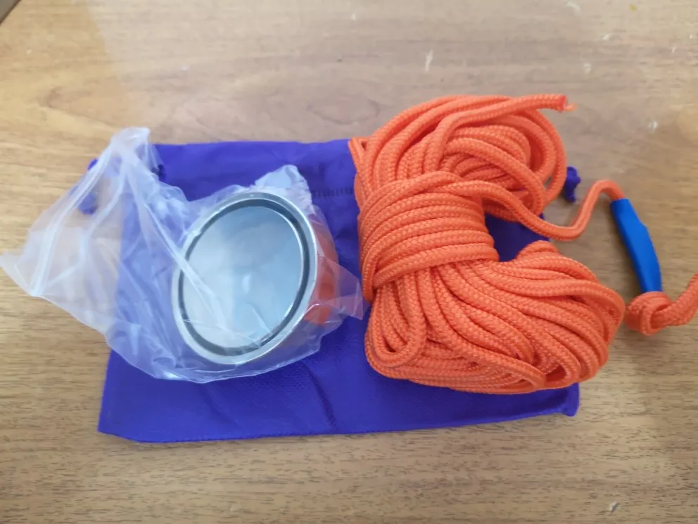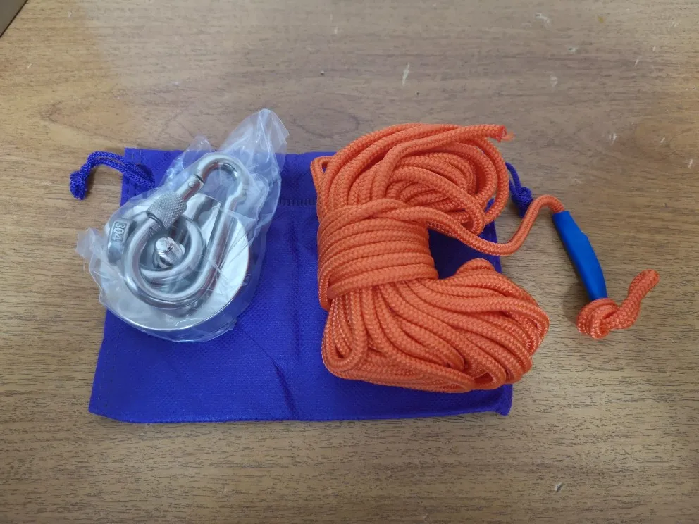 Посылка пришла быстро. Упаковано все в коробочку, сверху пупырка. В комплекте магнит, веревка, карабин, мешочек. Магнитит отлично, проверю на отрыв 200 кг чуть позже, когда буду чистить колодец. Рекомендую!