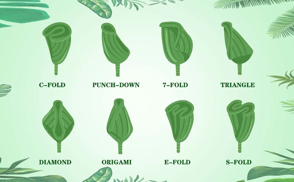 2. Сложите менструальную чашку так, чтобы широкое открытие менструальной чаши было меньше для введения. Двумя наиболее популярными способами являются: Пробивной и c-образной.
