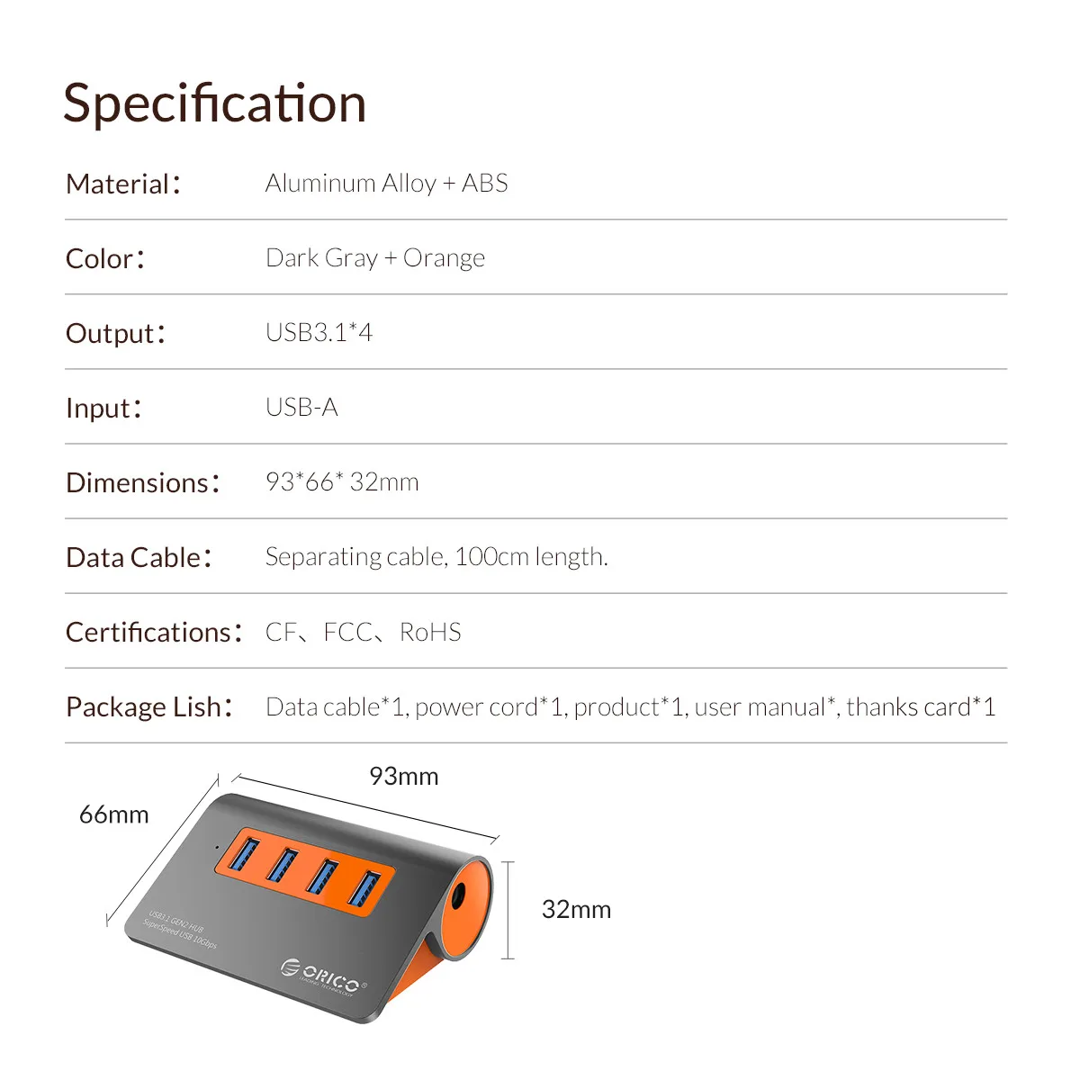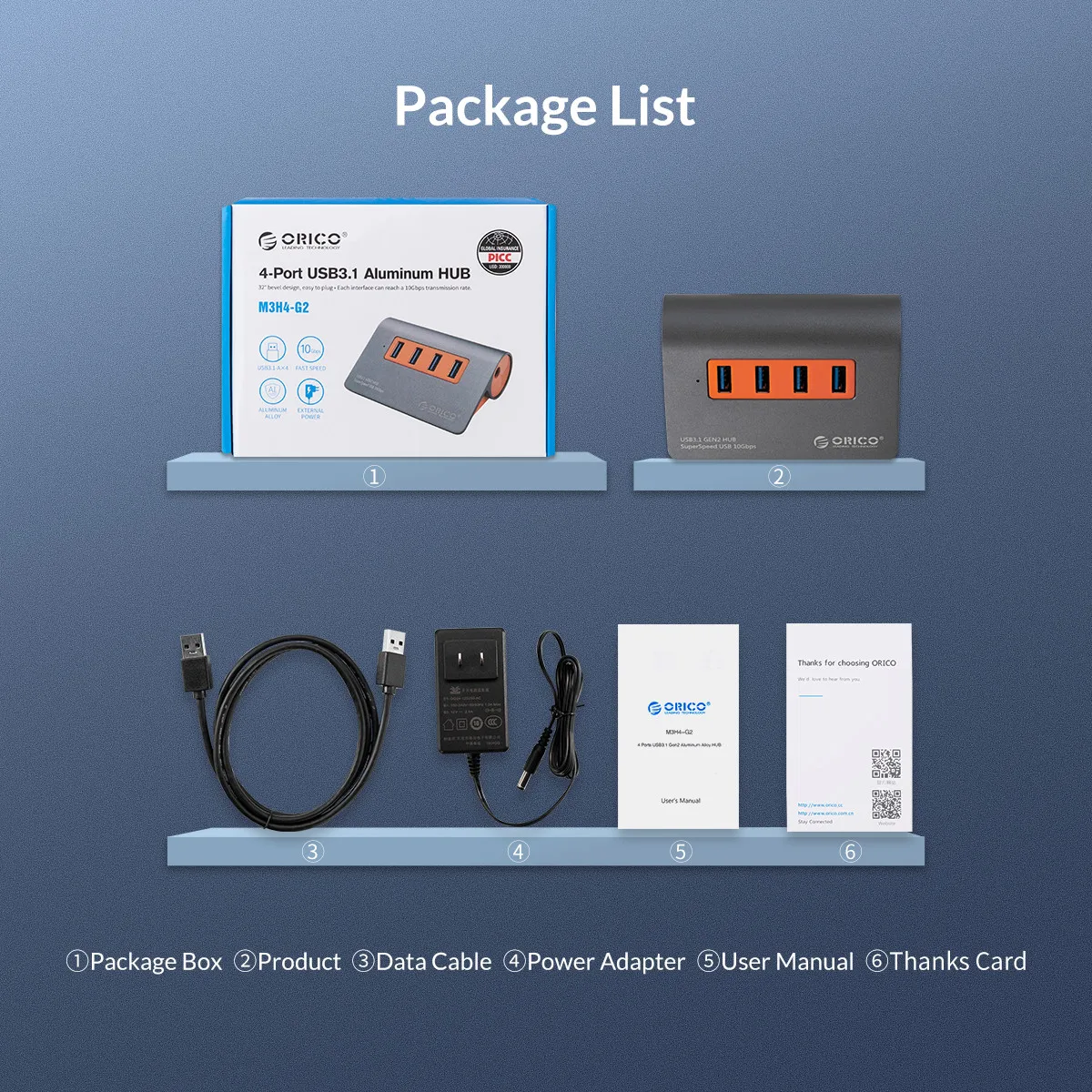 Концентратор ORICO USB3.1 Gen2, 10 Гбитс, алюминиевый, usb-хаб с адаптером питания 12 В, OTG, разветвитель, USB, несколько портов, периферийное устройство для компьютера
