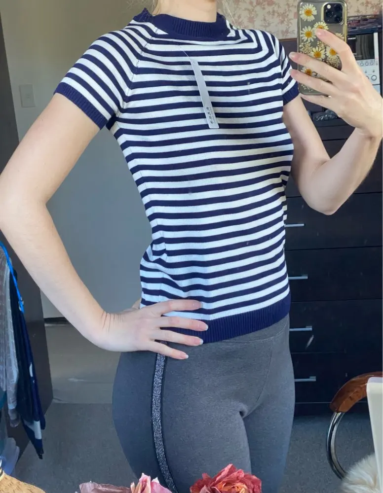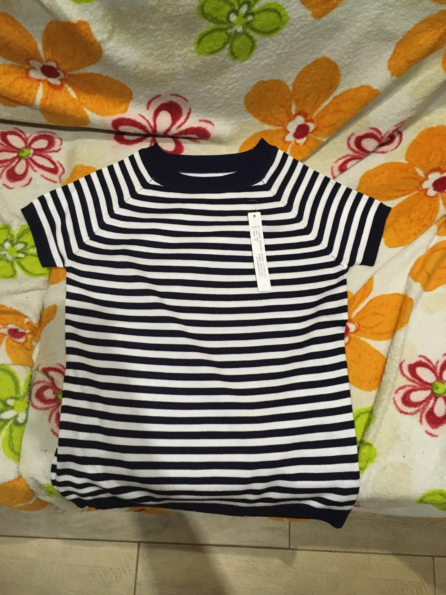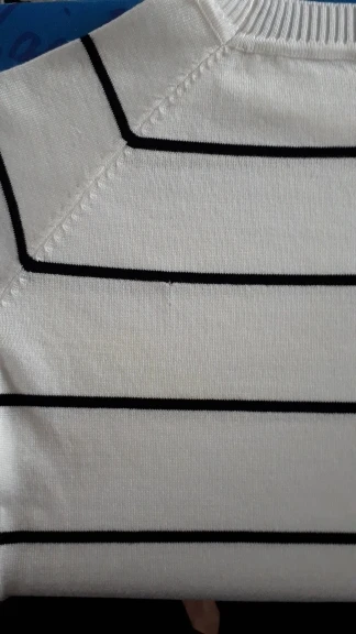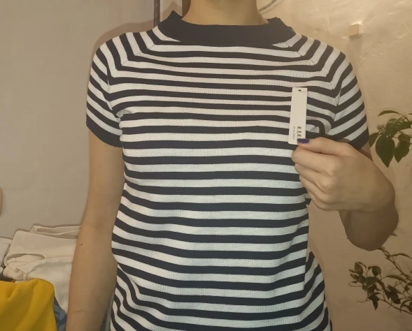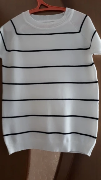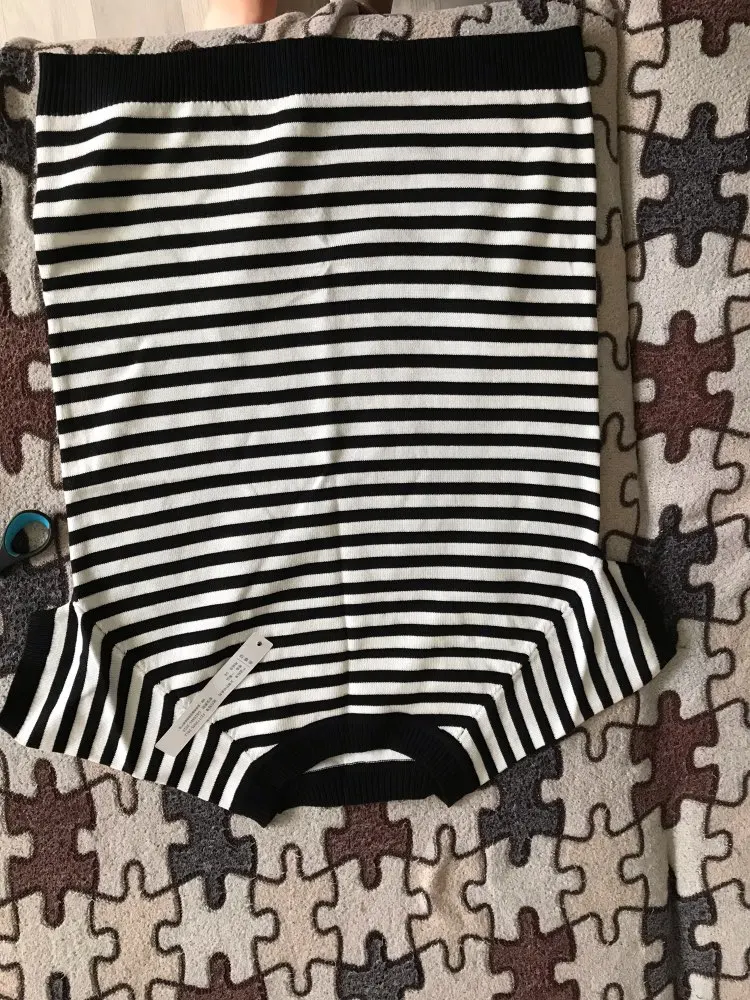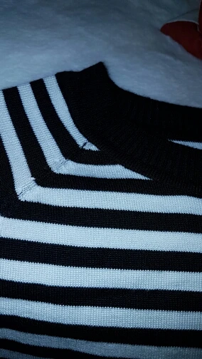 Так как полоски горизонтальные, то широкие плечи делает ещё шире, не учла это. Материал очень хороший, к телу приятный