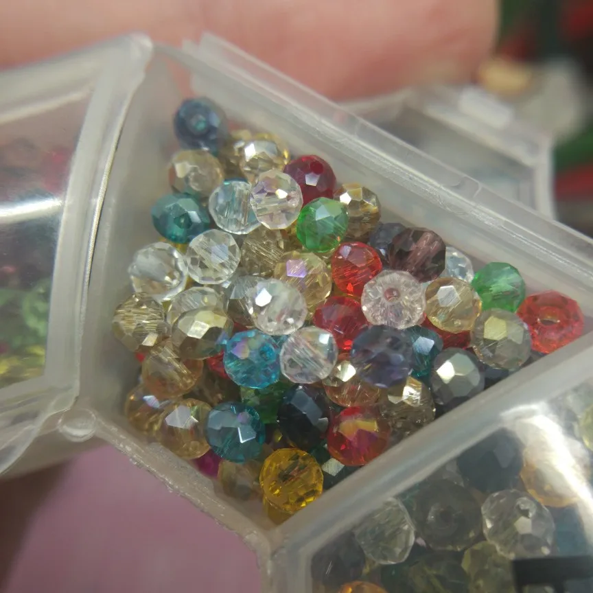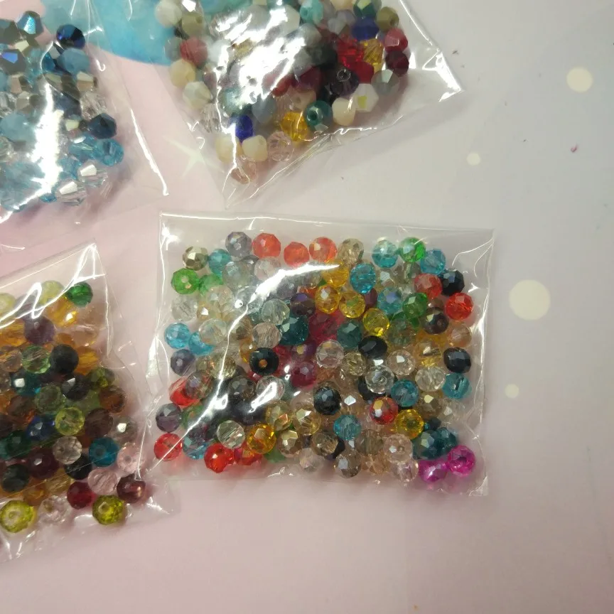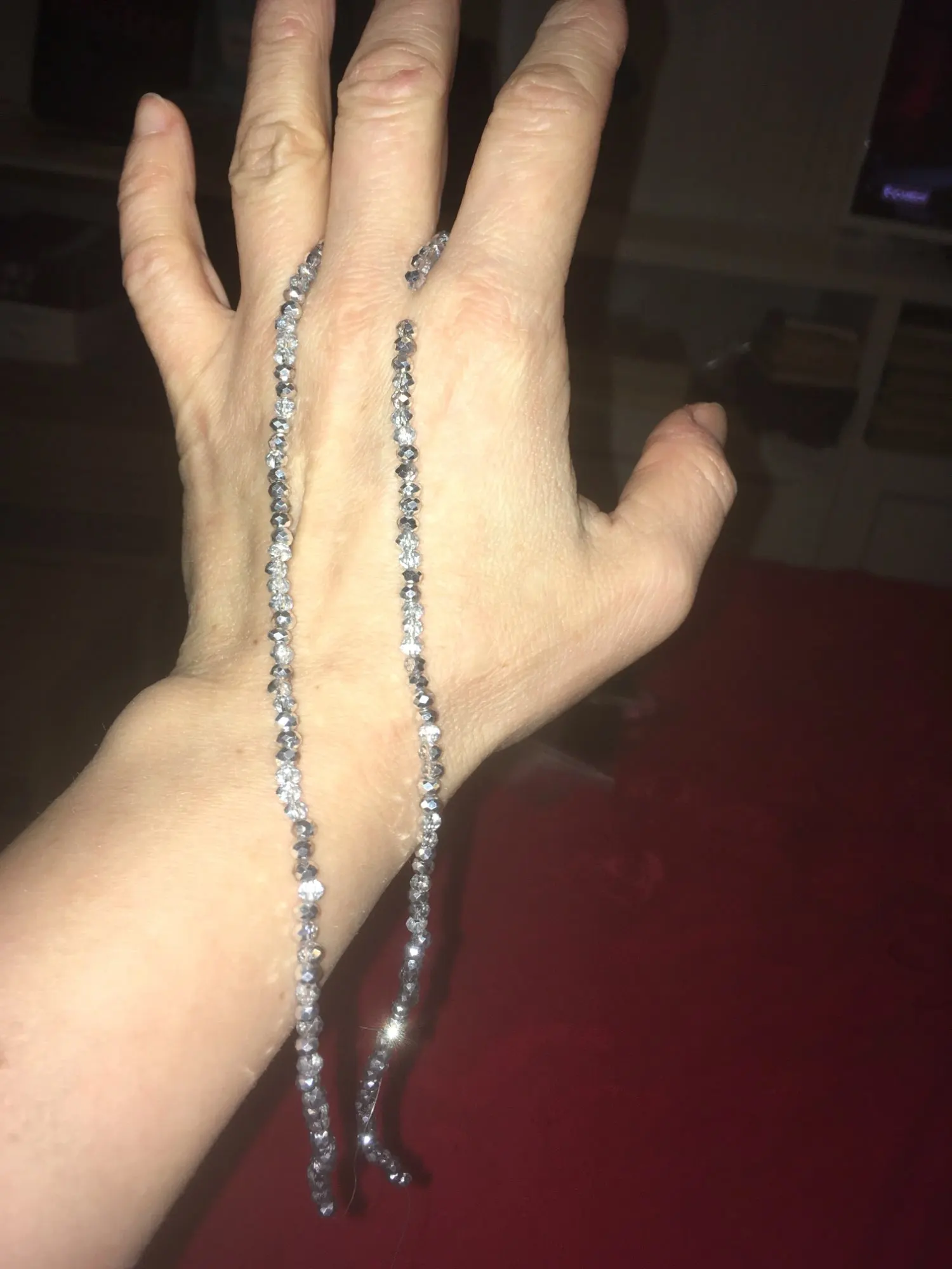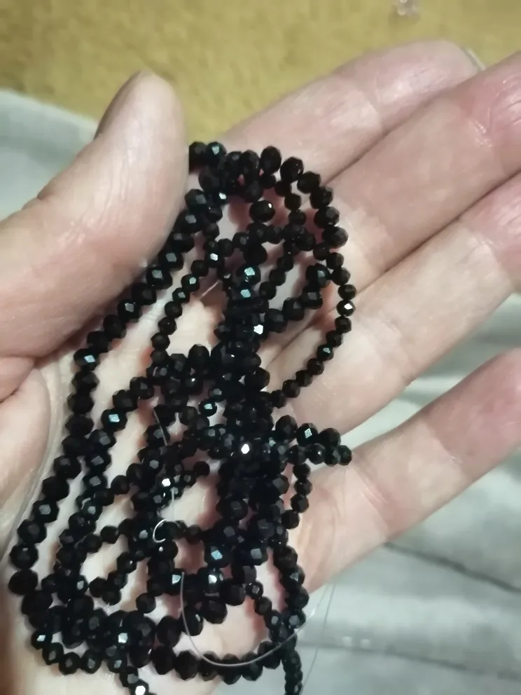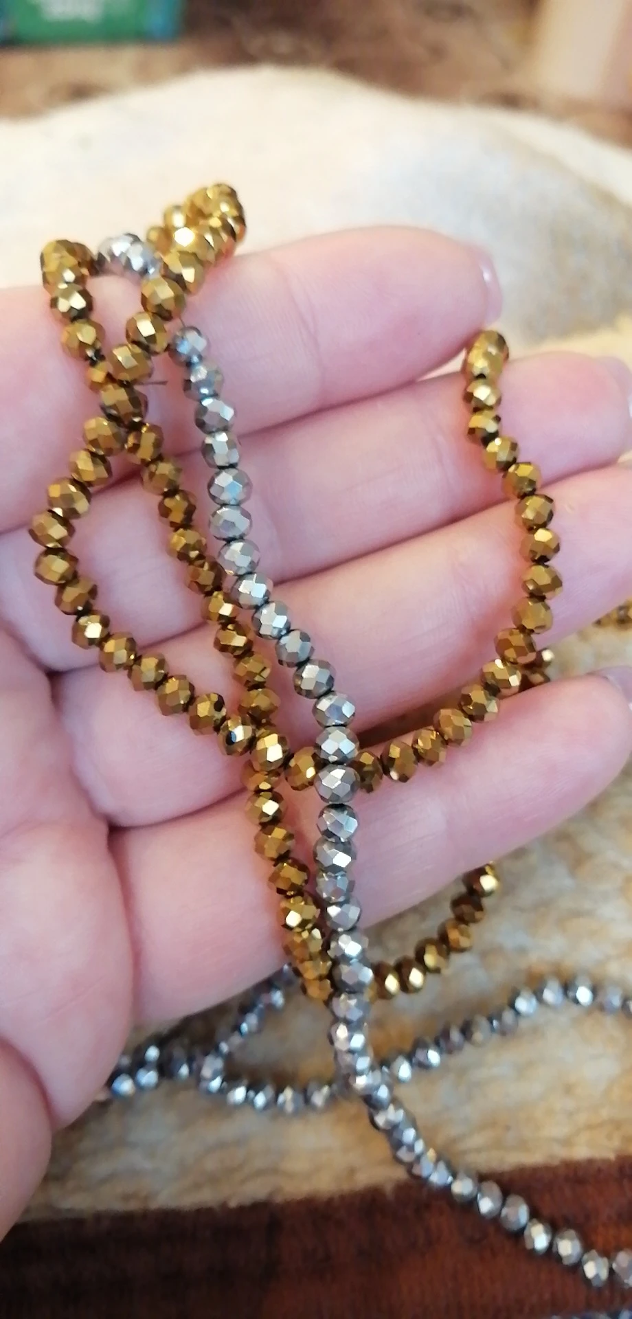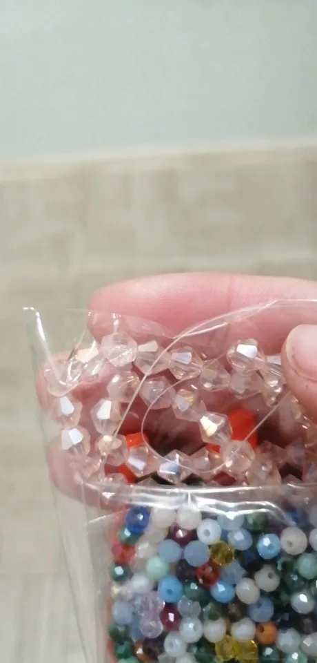 Нанизаны на леску , можно прикрепить замочек и будут бусики ) красиво переливаются и искрят на свету . Каждая бусина наполовину прозрачная и наполовину покрыта серебристым покрытием . Размер бусин 3x4 мм, 135 бусин , длина нитки с бусинами 45 см