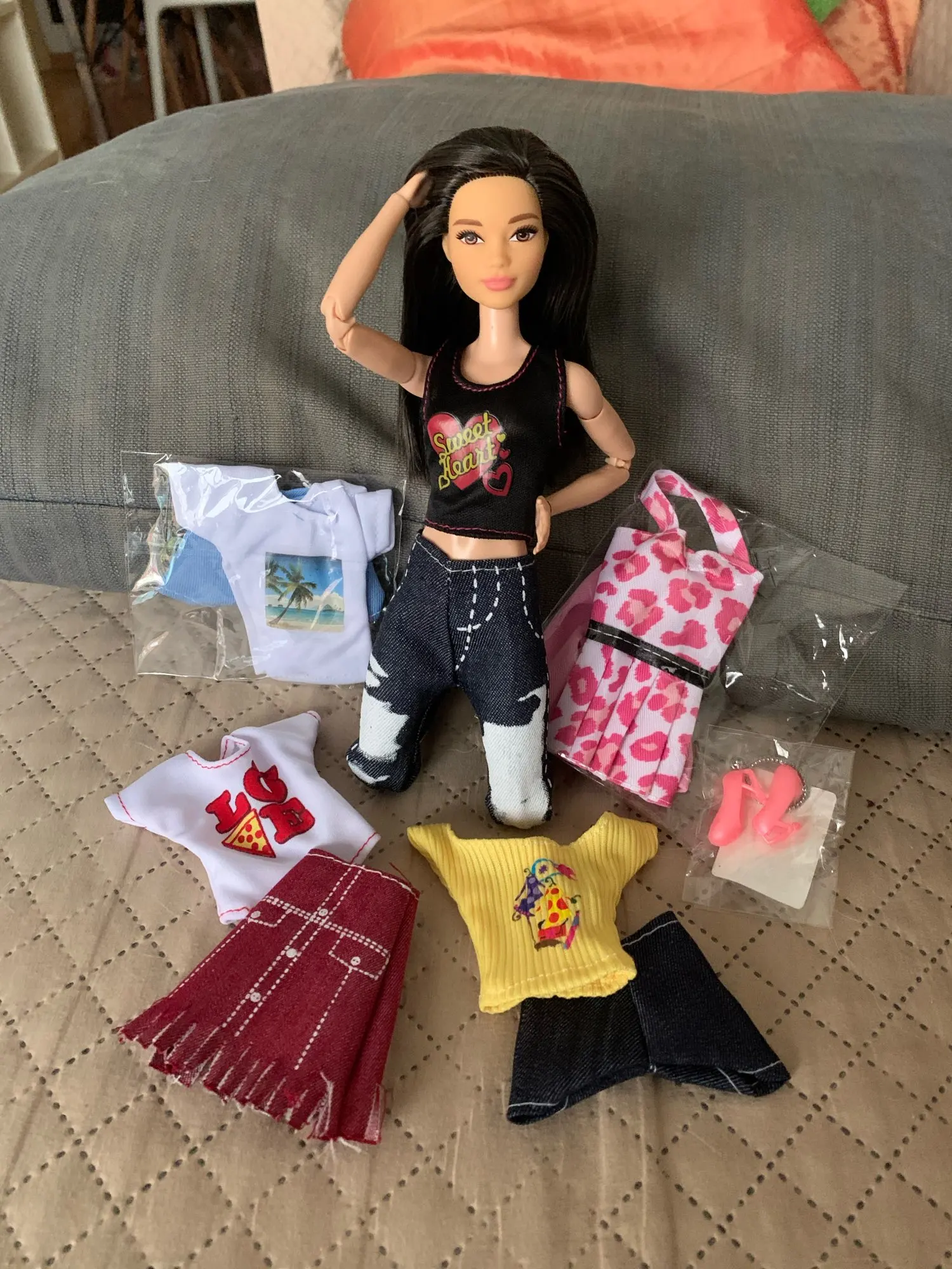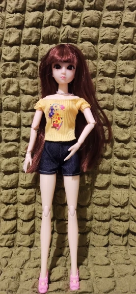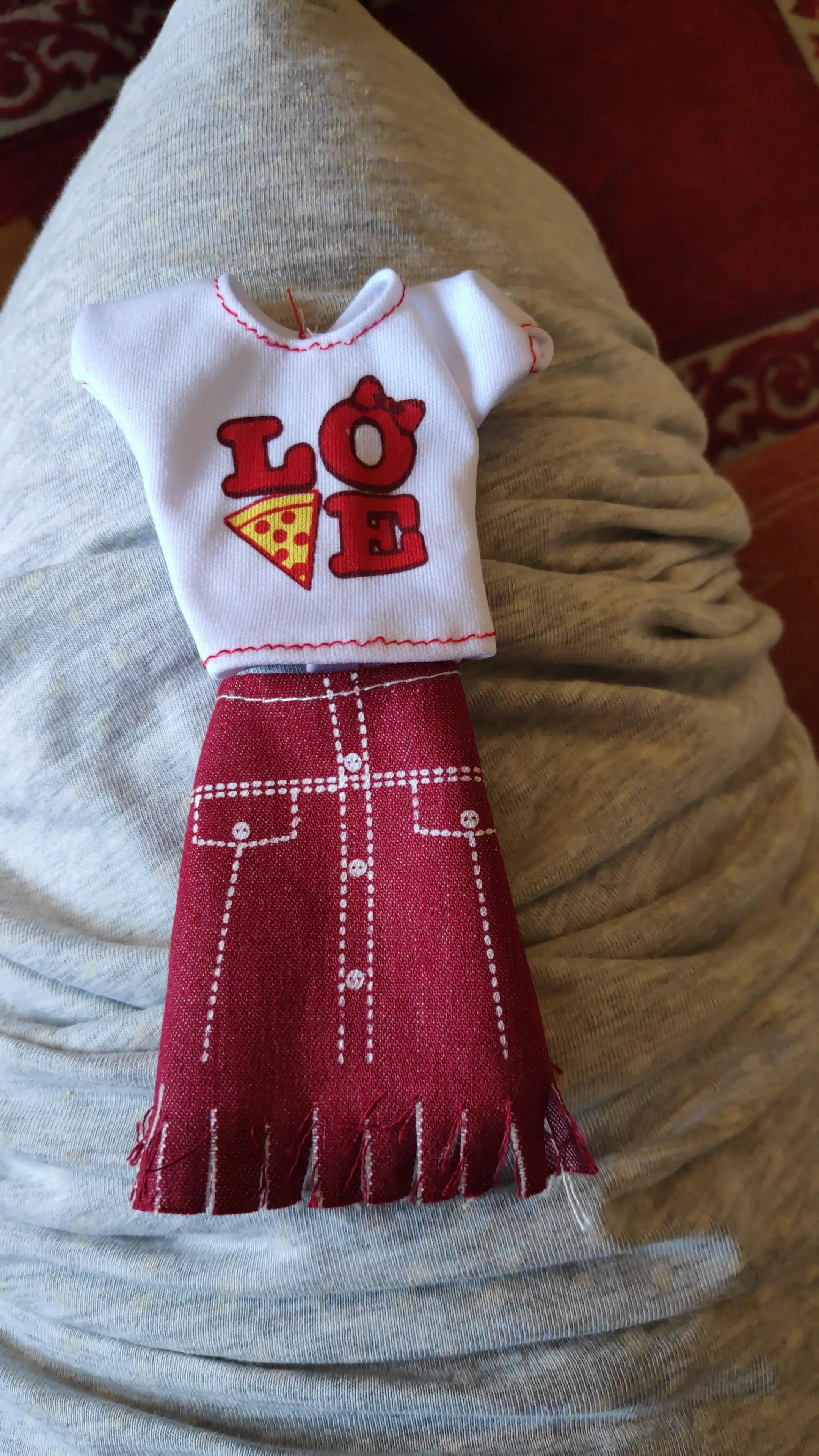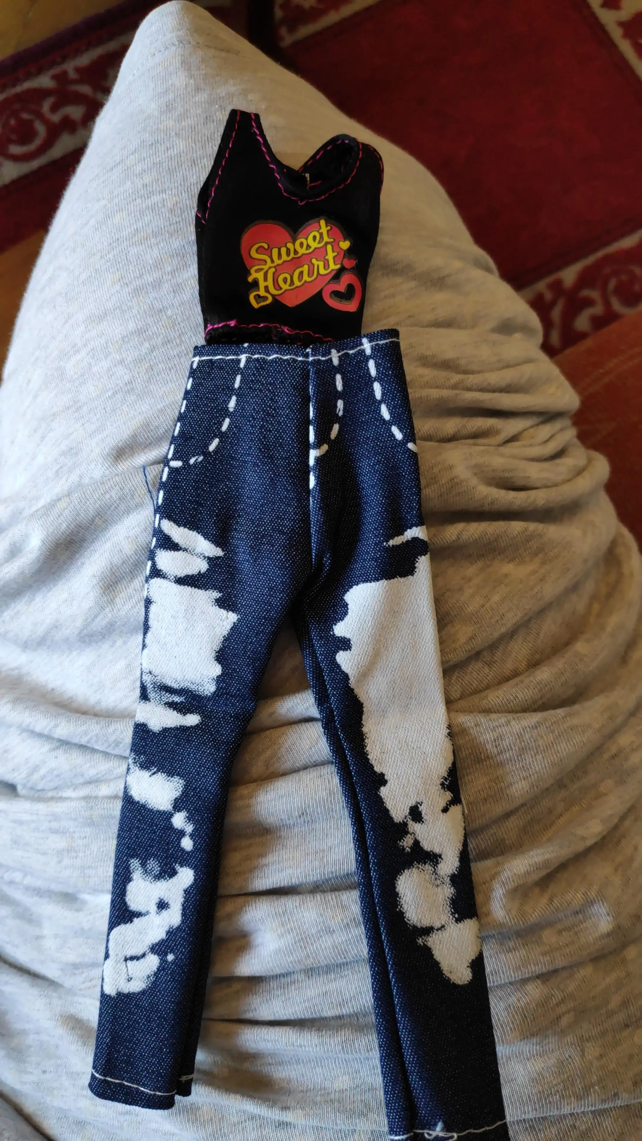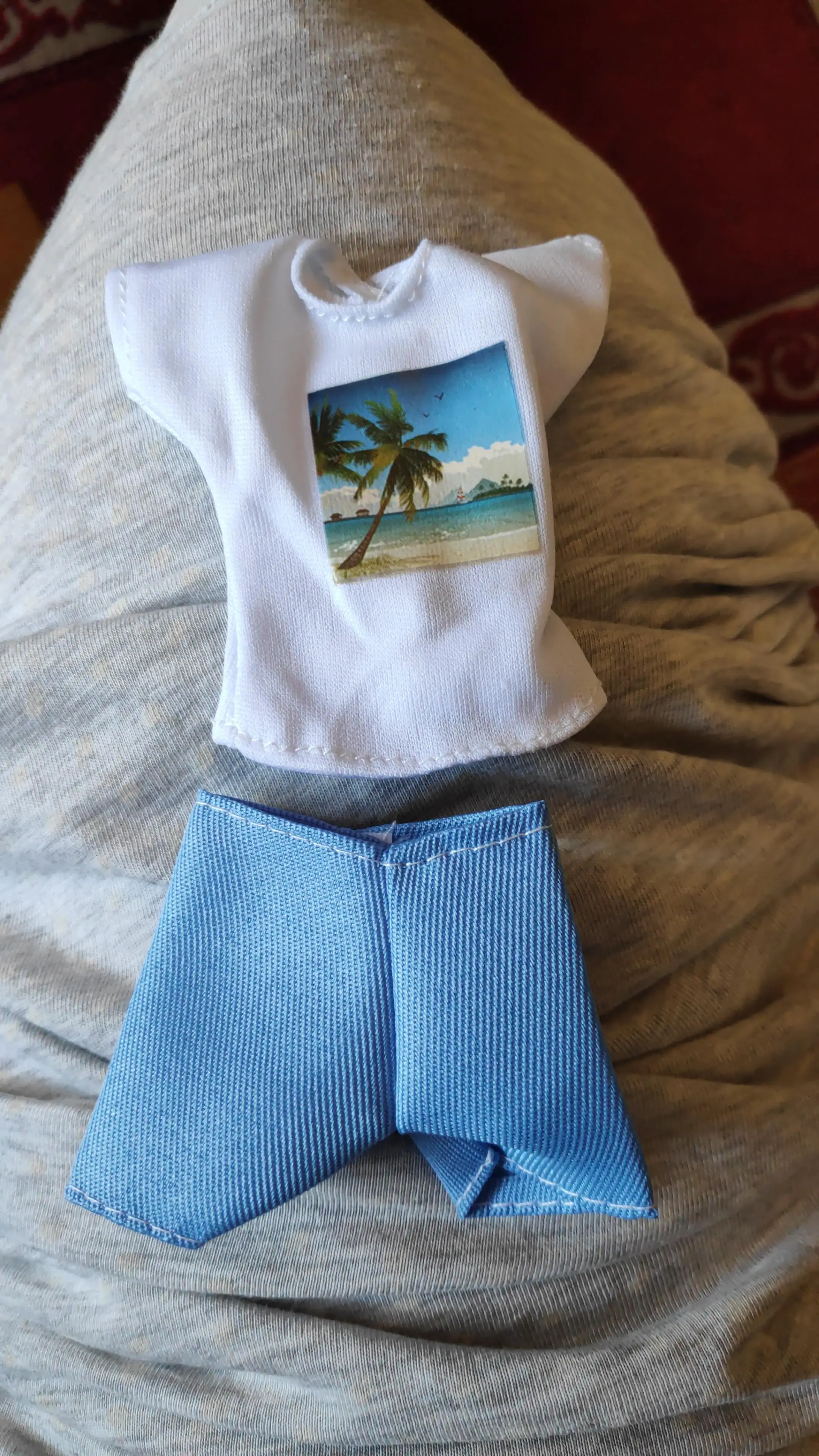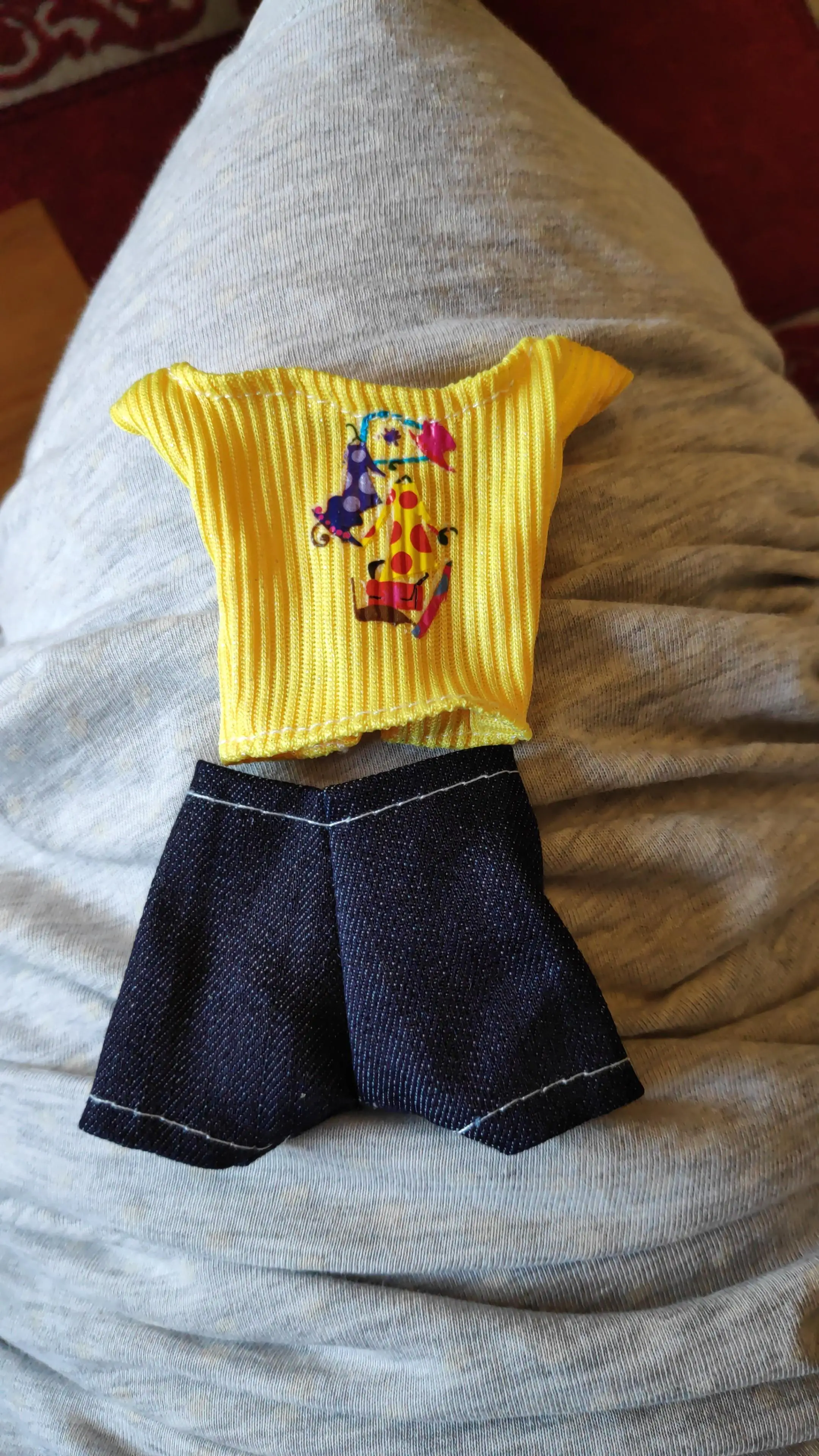 Купила в этом магазине два комплекта отдельно и один набор из пяти костюмов. Могу сказать, что качество отдельно купленной одежды мне понравилось чуть больше, чем в наборе, но в общем все недорого и неплохо относительно сшито. Набор этот купила в основнем из-за маек с принтами, в итоге мне очень понравились белые и желтая футболки, джинсы с потертостями хорошие. Красная юбка нуждается в доработке, края не обработаны и нитки лезут очень. Шорты норм, не супер. У чёрной майки горловина обработана странно, не уверена, что исправить получится. Розовый костюм не понравился, хотя на фото выглядит неплохо. Бретель сразу отрезать можно, держится и без неё, а с ней не надеть
