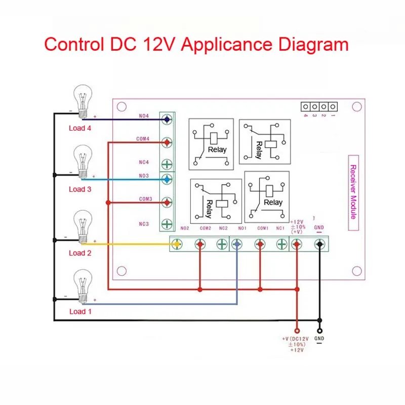 1. Рабочее напряжение: DC12V ± 10%2. Ток: в режиме ожидания менее 10 мА, работает менее 128 мА3. Рабочая температура: -10'C-+ 60'C4. Частота приемника: 315 МГц/433,92 МГц5. Чувствительность приема:-105дБ6. Выходное состояние: значение для переключения7. Максимальная нагрузка: реле 10А, резистивная нагрузка менее 8А, Индуктивная нагрузка менее 3а8. Размер платы приемника: 70*50*18 мм9. Чехол Размеры: 75*55*30 ммТип кодирования: код обученияДобавить передатчик с помощью кнопки обучения на приемнике Выходное состояние: регулируется перемычкой на плате приемника, Мгновенный----- Перемычка на 1 булавке или снимите перемычку Тумблер------- Джемпер на "3 и 4" Фиксатор------ Джемпер на "1 и 2" Мгновенный----- Нажмите кнопку передатчика A, реле приемника A Включено; Кнопка отпустите A, реле приемника A выключено, то же, что и B/C/D Тумблер------- Нажмите кнопку передатчика A 1 раз, реле приемника A Включено; Нажмите кнопку A снова, реле приемника A выключено, то же, что и B/C/D Защелкивается ------ Нажмите кнопку передатчика A, реле приемника A Включено, реле B/C/D выключеноНажмите кнопку передатчика B, реле приемника B включено, реле A/C/D выключеноНажмите кнопку передатчика C, реле приемника C включено, реле A/B/D выключеноНажмите кнопку передатчика D, реле приемника D включено, реле A/B/C выключено Это означает, что блокировка может держать 1CH на, и он будет иметь 1CH на Методы обучения: Вход питания DC12V для приемника, нажмите кнопку обучения, зеленый светодиодный индикатор выключен, затем нажмите передатчик, светодиодный индикатор быстро мигает, это означает, что обучение успешно. Очистка кода: Удерживайте кнопку обучения 8 секунд, пока светодиодный индикатор не включится, это означает, что код был успешно очищен.