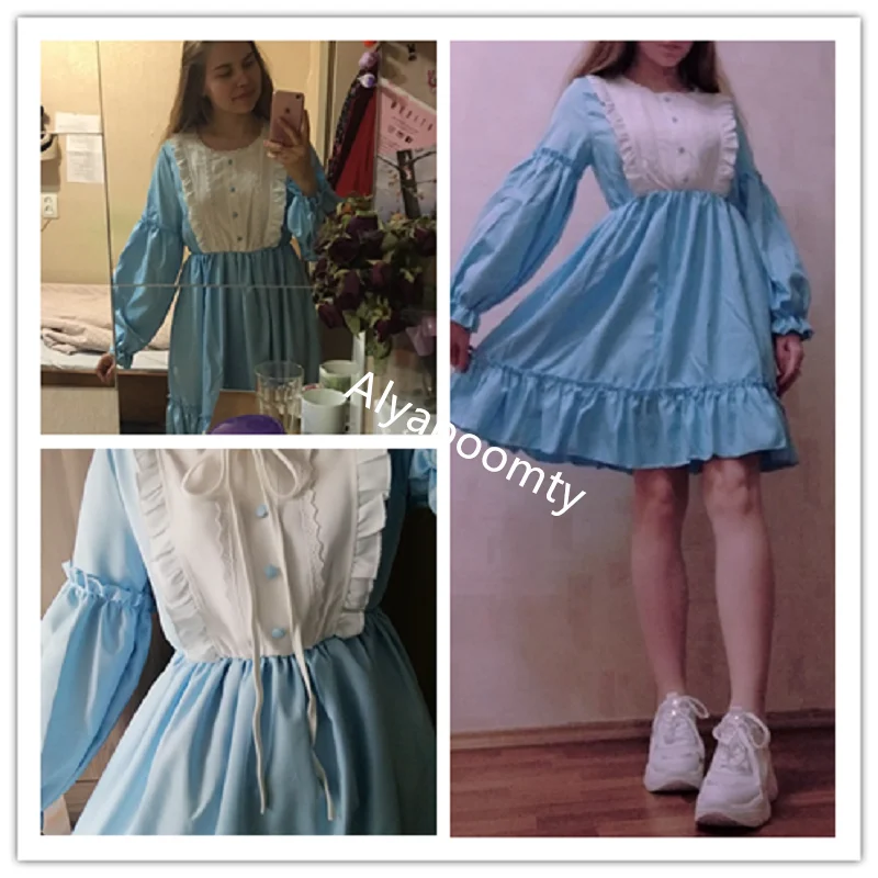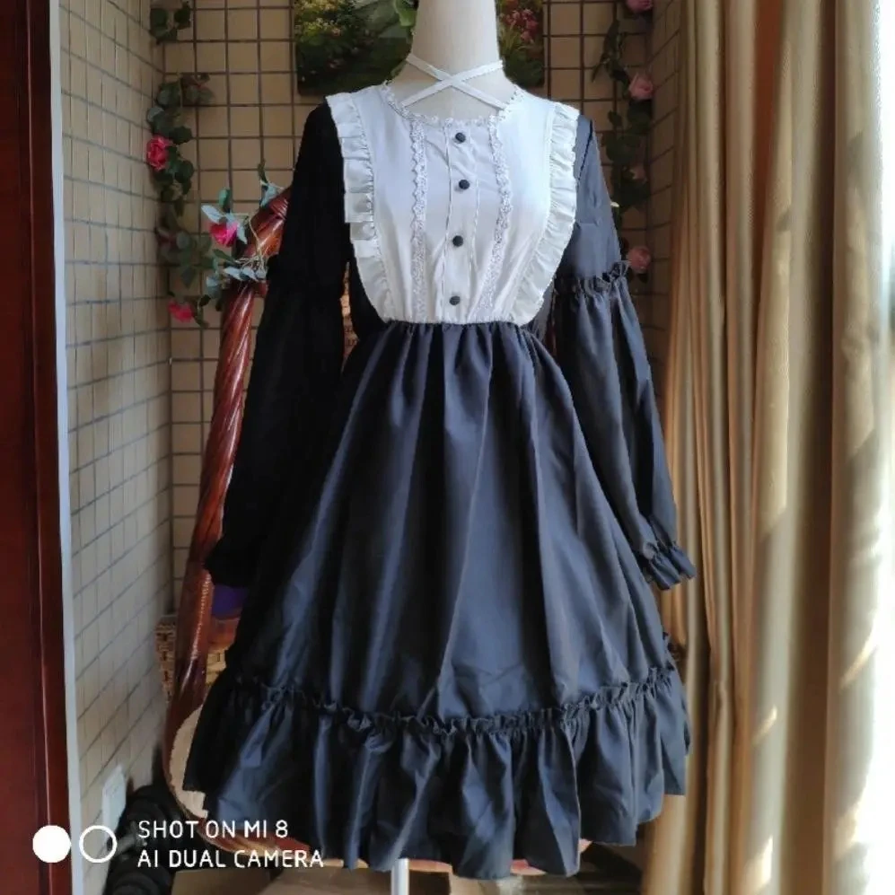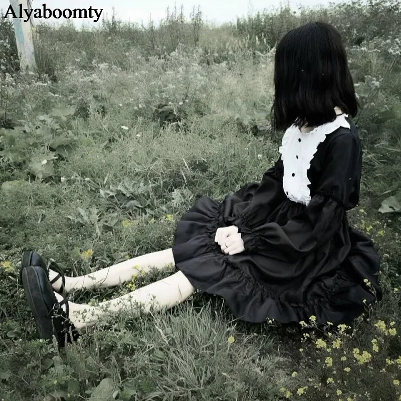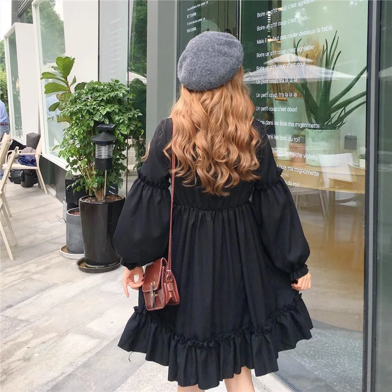 Женское кавайное короткое платье весна-осень,милое платье японского стиля"Лолита",симпатичное платье с оборками и длинным рукавом,женственное повседневное платье,черного и голубого цвета