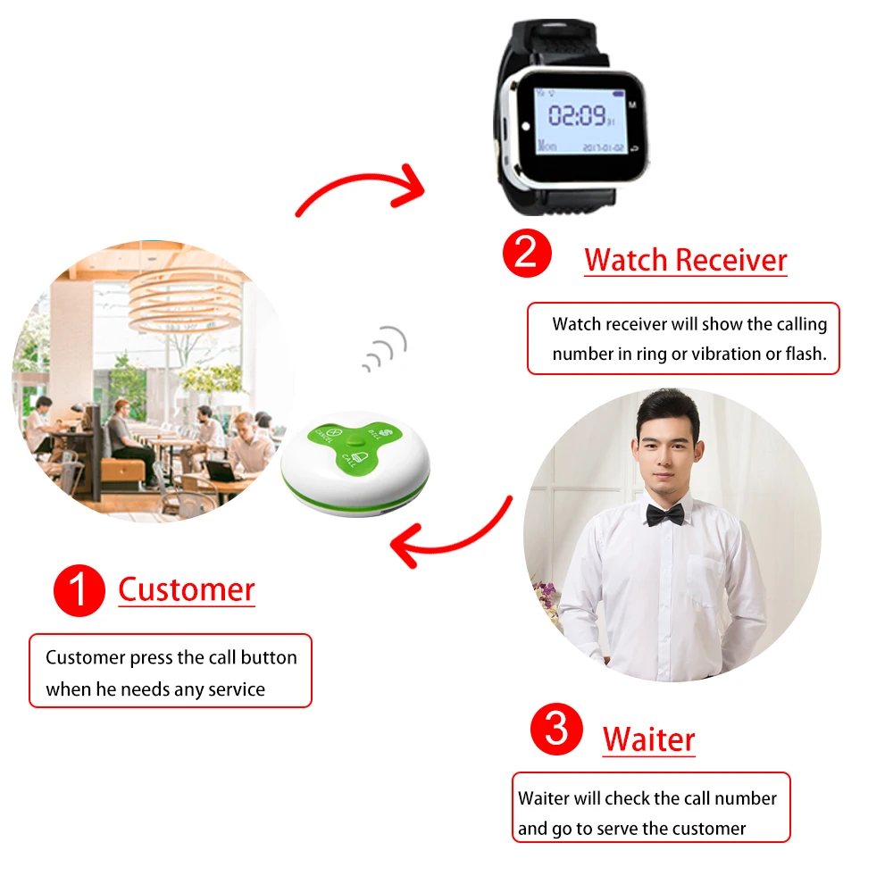 Во-первых, кнопки вызова вставляются или ставятся на стену или на стол, когда у гостей есть какие-либо услуги, он или она нажимает кнопки вызова, приемник (светодиодный экран или пейджер часов) получите сигнал с вибрацией или звуком, показывая номер таблицы, Тогда официант будет знать, какой стол будет подан.