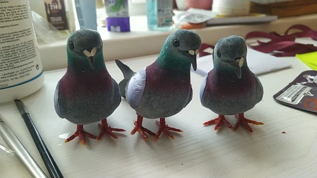 упаковка товара очень плохая 2 пакетика тонких и все, удивительно как голубь вообще пришёл в целости, петуху повезло меньше, у него сломалась лапа, в месте залога раскрошился пенопластовый каркас. склеить возможно, но не все и красоты не получится. фигурки маленькие, с лодошку. качество исполнение нормальное.