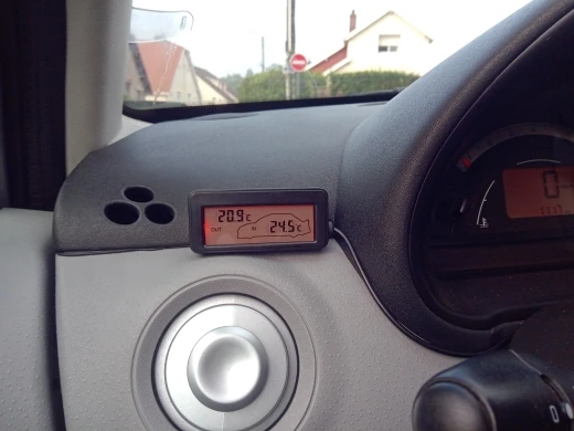 Измеряет и отображает температуру (Цельсия) в вашем автомобиле, а также температуру снаружи