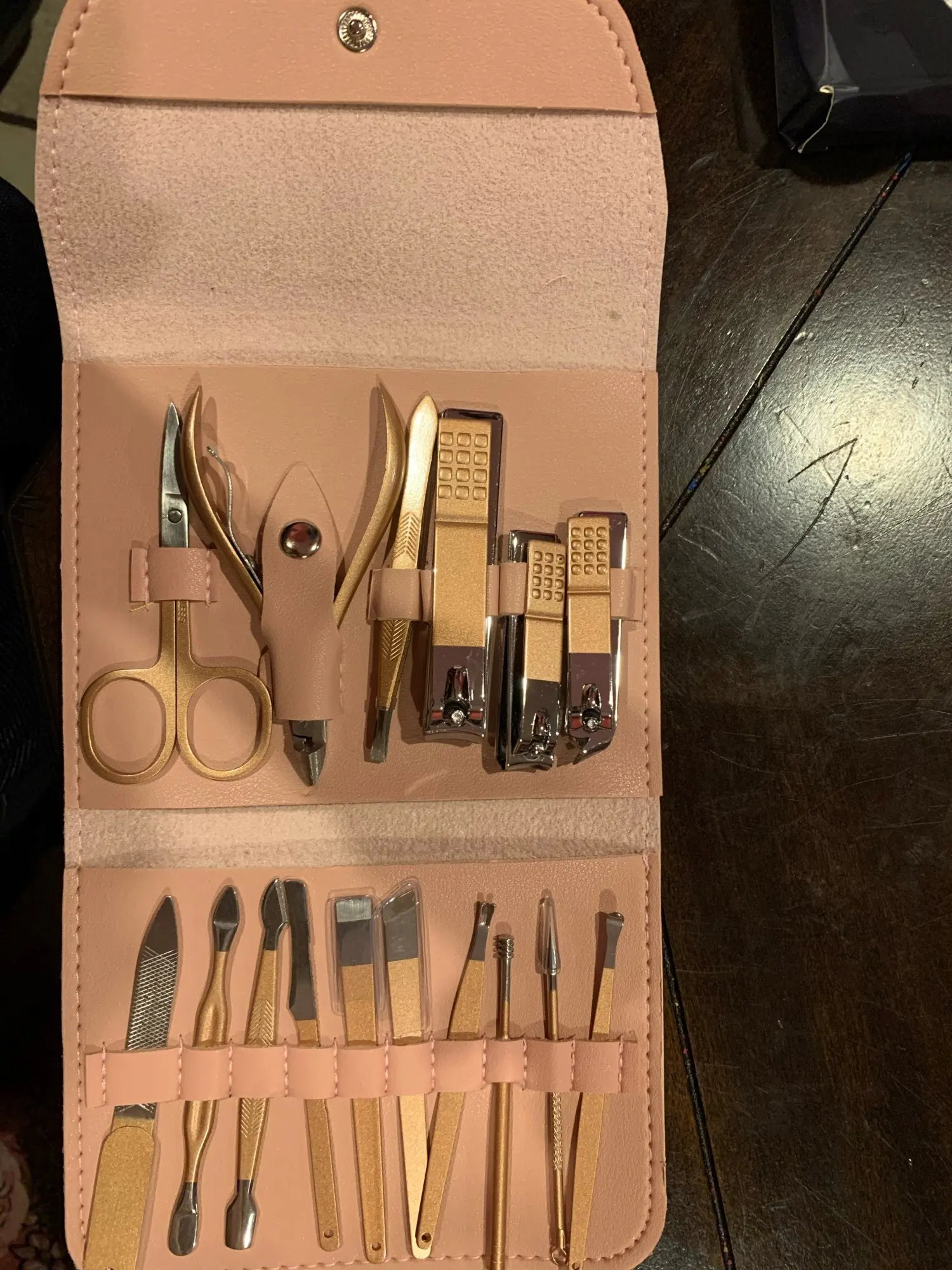Долго шло. Выглядит симпатично, но качество исполнени так себе, ещё посмотрим что жена скажет в примирении как. На одних щипчиках есть царапина и от внутренний стороны нету цвета как на остальных инструментах.