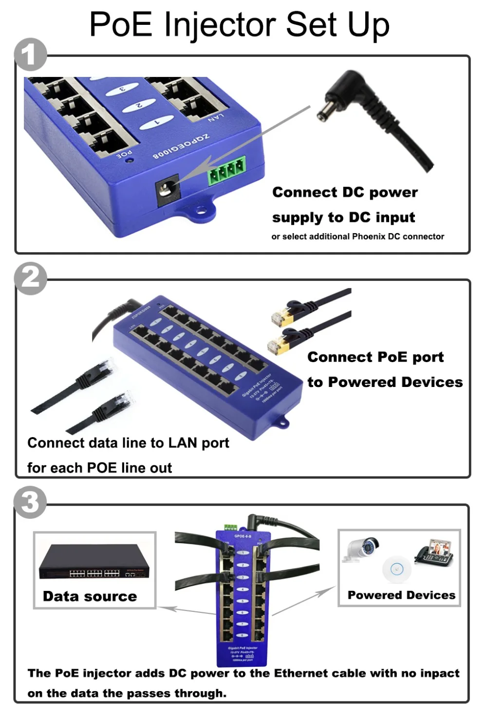 Инжектор ZQPOEIG008 Power over Ethernet (POE) позволяет подключать до 8 устройств удаленно через проводку ethernet до 328 футов (100 метров). Добавьте PoE возможность к любому Ethernet-коммутатору или маршрутизатору. Используйте это устройство для включения питания в Кабель CAT-5, CAT-6 или CAT-7 и устройства питания, такие как камеры, VOIP телефоны и точки доступа Wi-Fi.