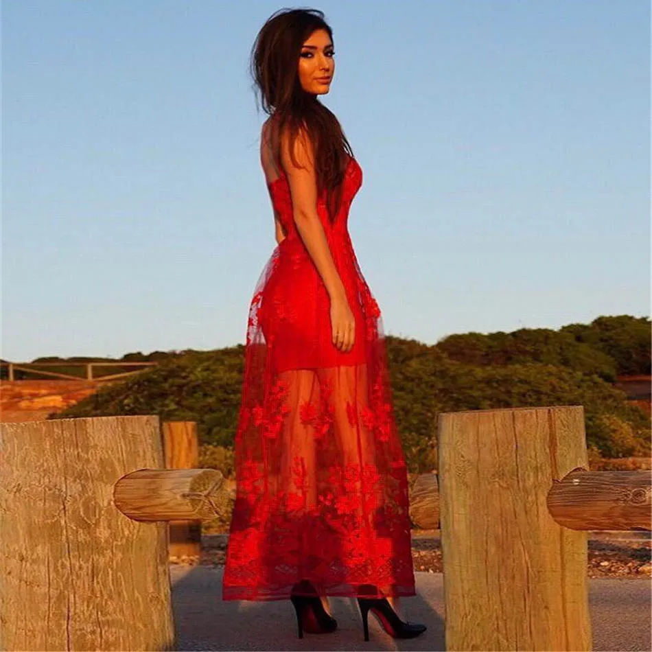 Женское Бандажное платье, Красные кружевные ажурные длинные платья на бретелях-спагетти без рукавов, облегающее платье макси для клуба, вечеринки, элегантное сексуальное
