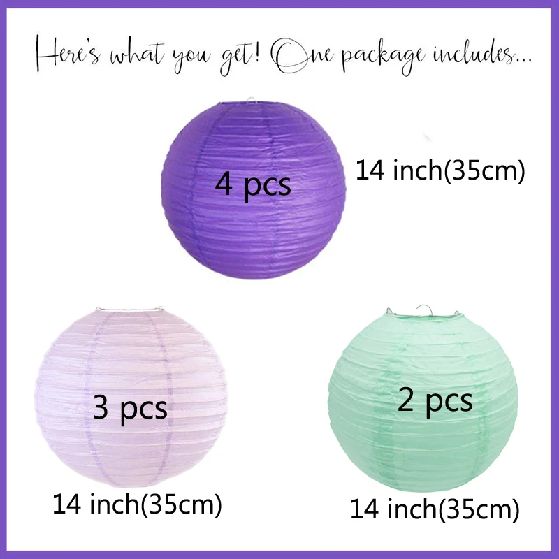 9 шт.компл. 14 дюймов, большой китайский бумажный фонарь, 3 цвета, круглый фонарик, Свадебный, фиолетовый, мятно-зеленый, для свадьбы, подвесной шар, домашний уличный Декор
