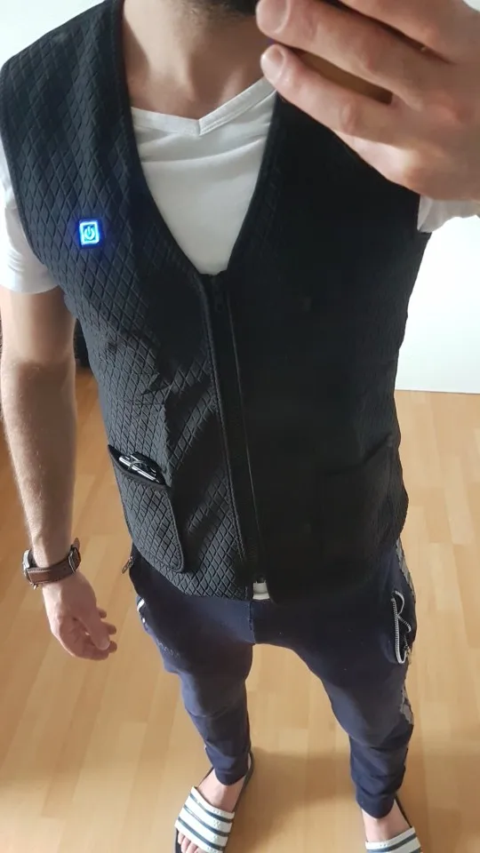 По рекомендациям брал xl, чтобы было ближе к телу. Идеально на майку или тонкий свитер под вес 78 кг, рост 184. Отлично сидит. Греет хорошо. Постирал в стиральной машине на 40 градусах, хотя этого нельзя делать по-инструкции. Запах почти пропал. Жилет работает.
