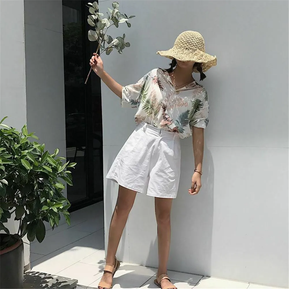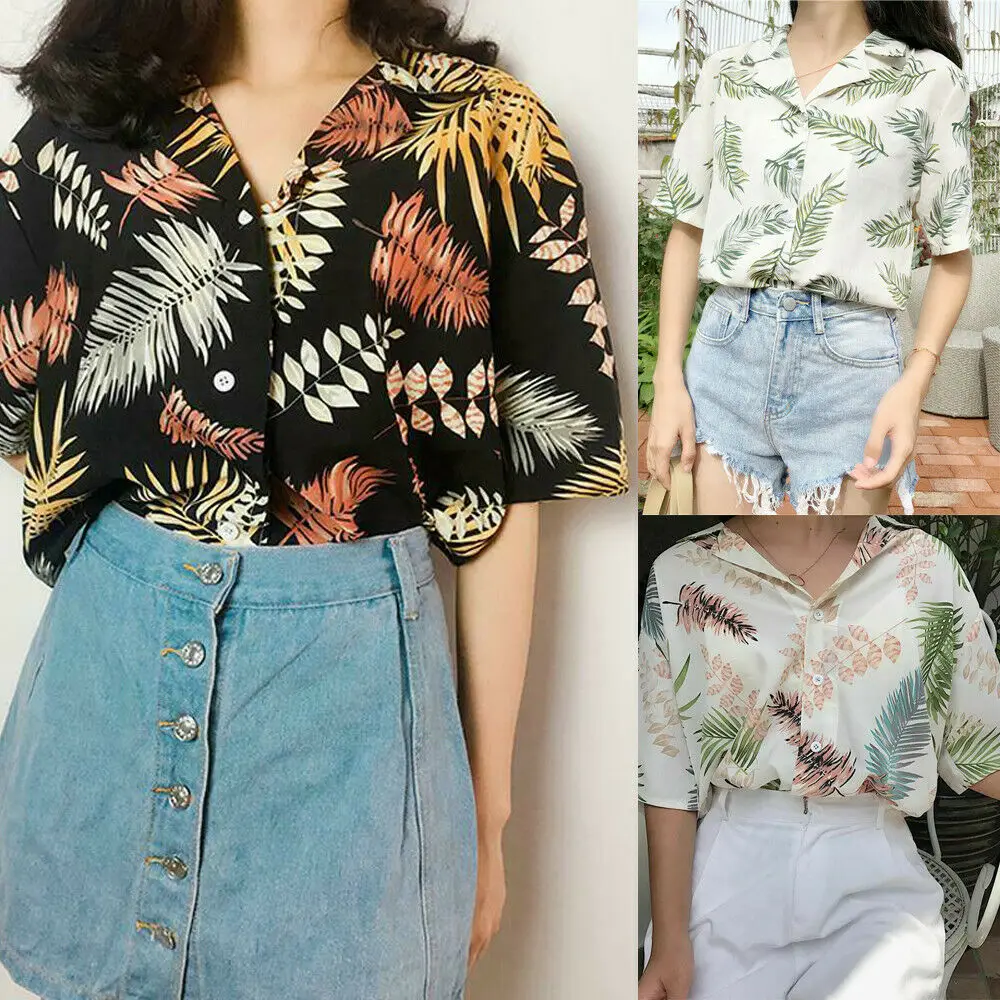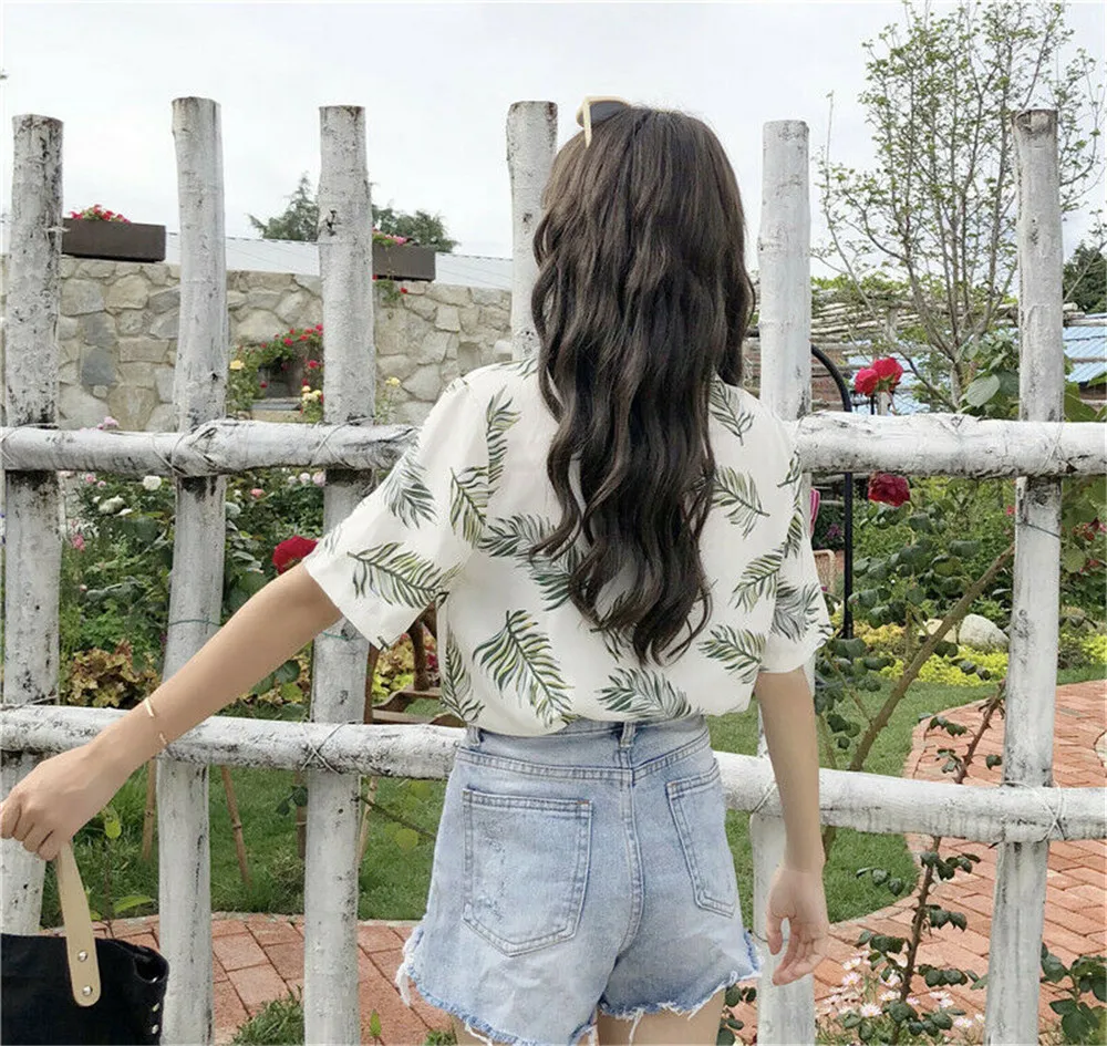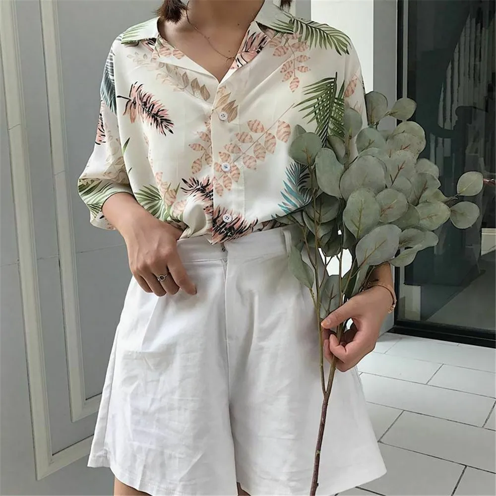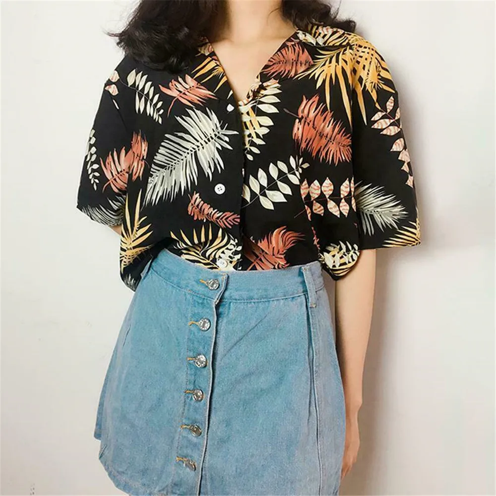 Женская гавайская рубашка с цветочным принтом, летняя Свободная Женская блузка, пляжные топы с принтом, повседневные топы с коротким рукавом и v-образным вырезом