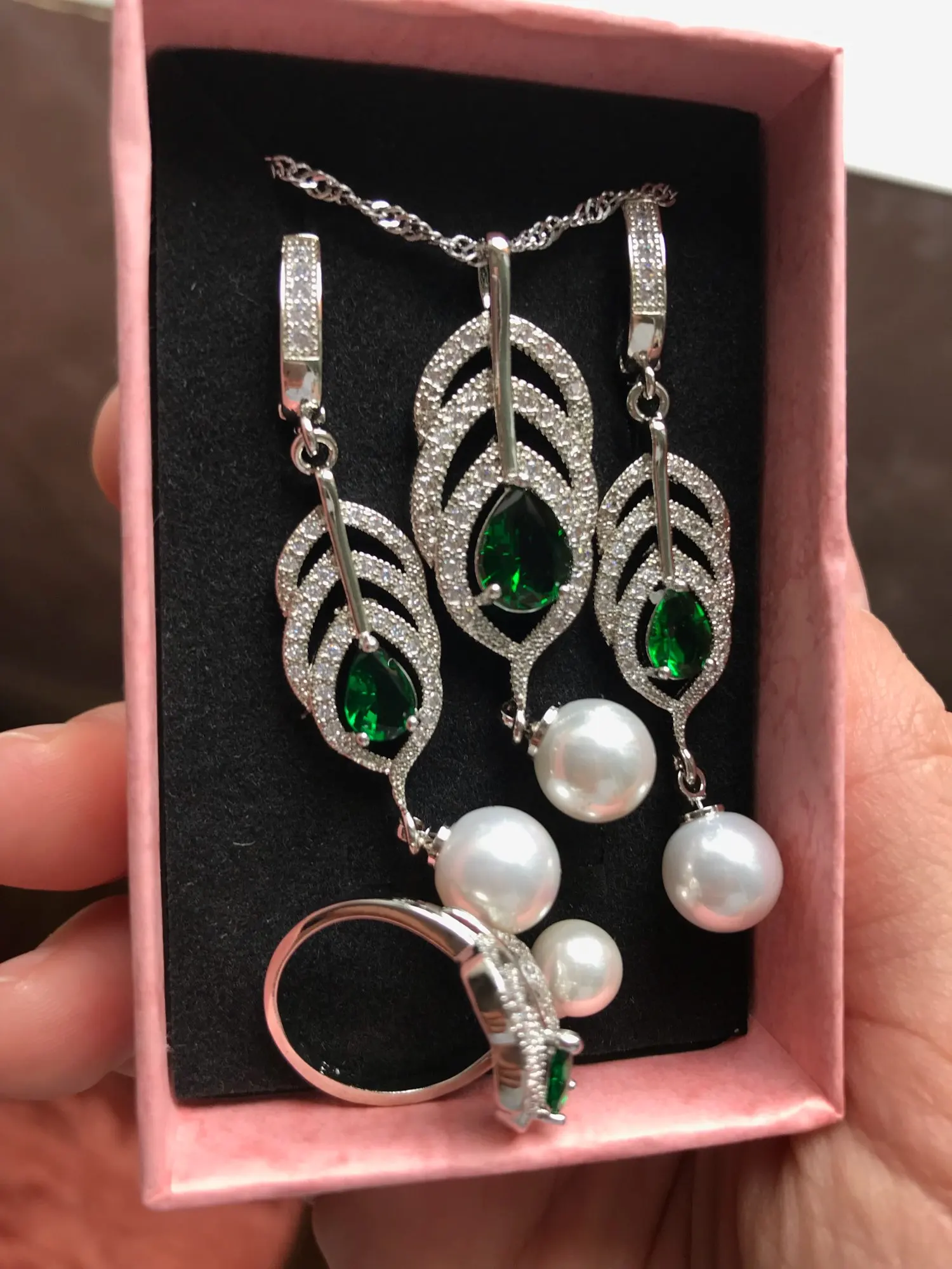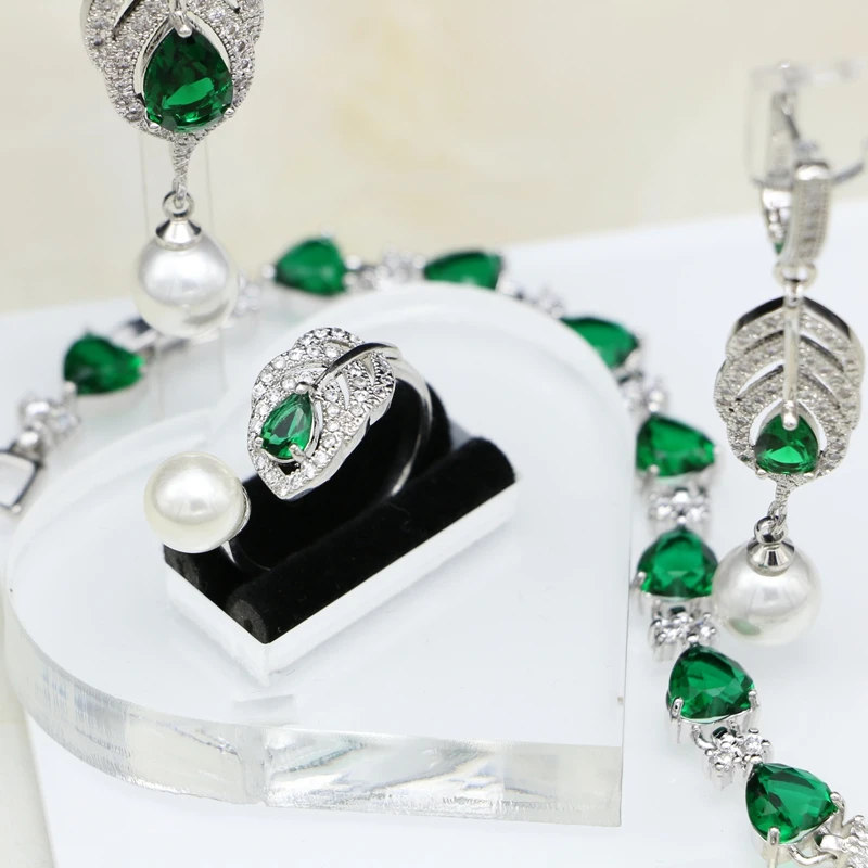 Набор свадебных ювелирных изделий из серебра 925 пробы с зеленым белым жемчугом из фианита для женщин, свадебные серьгикулоножерельеКольцобраслет