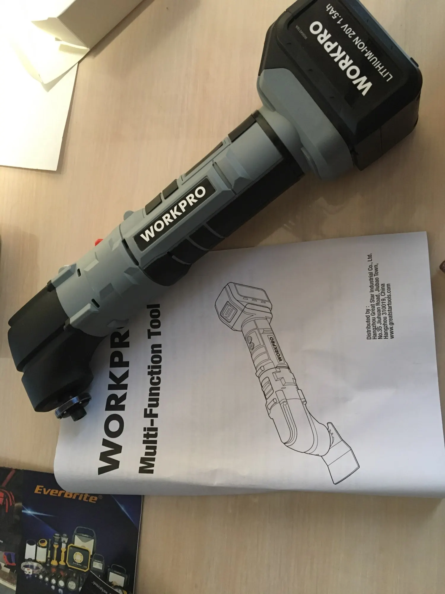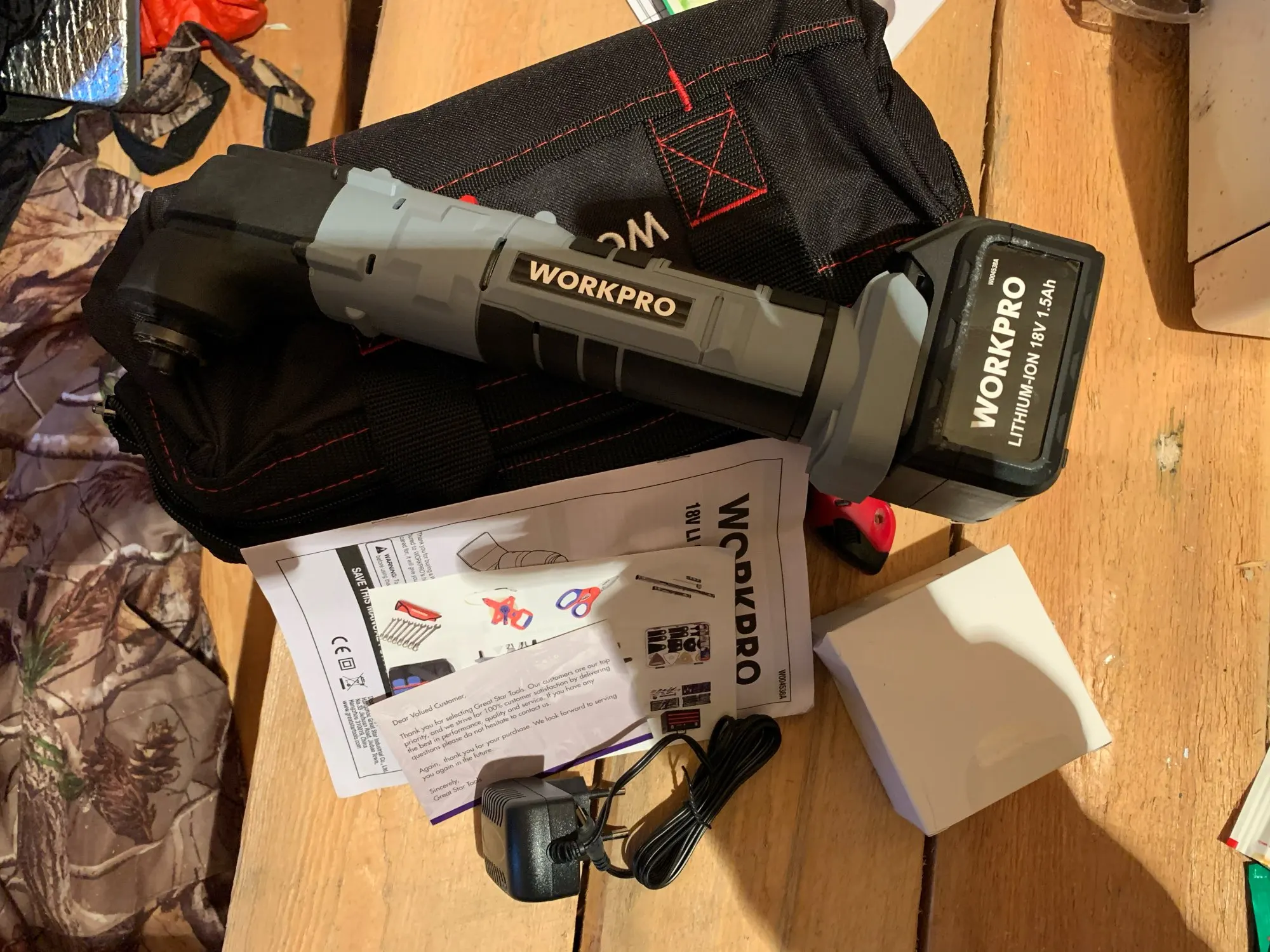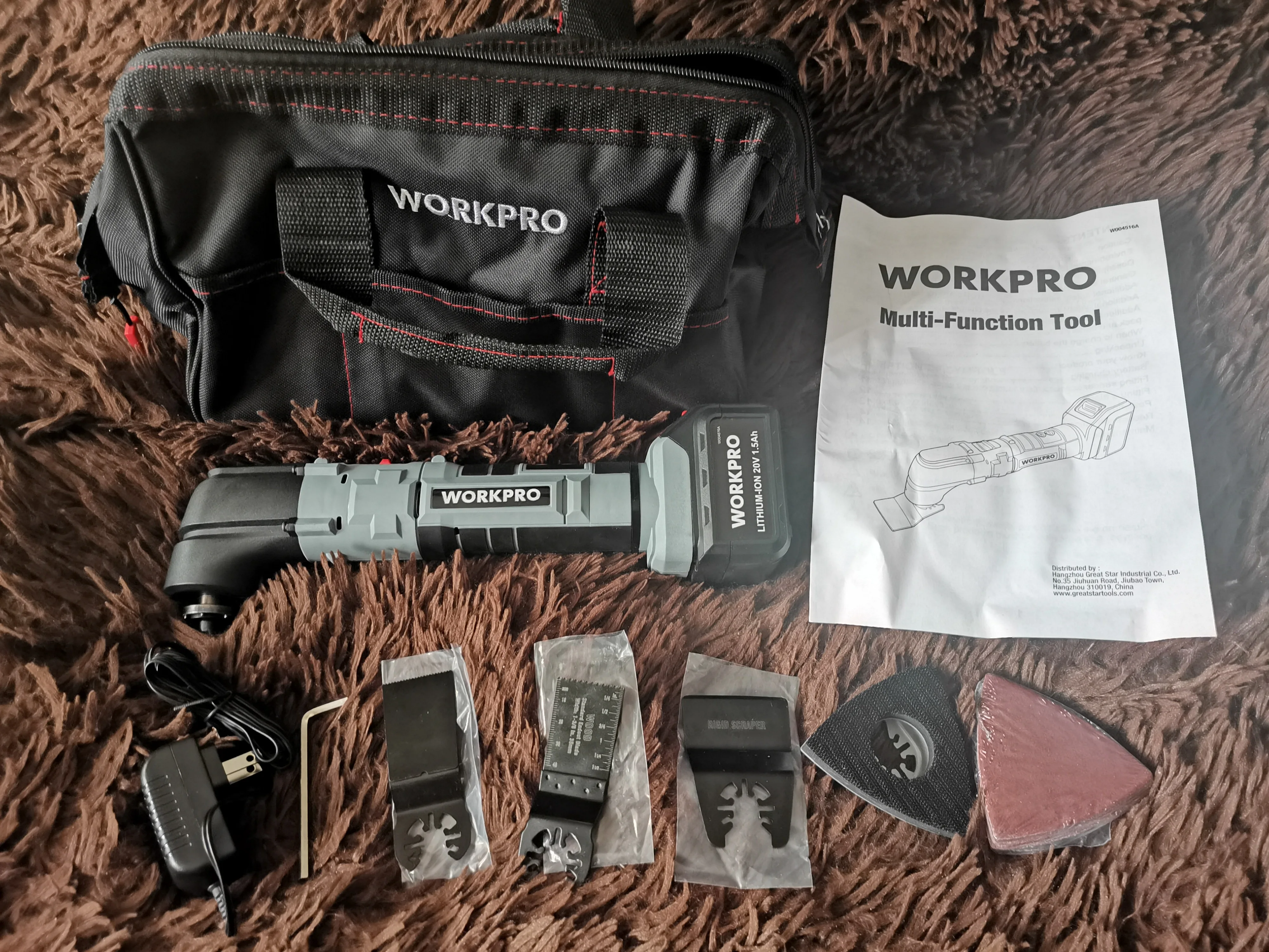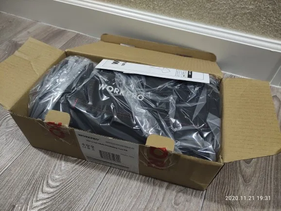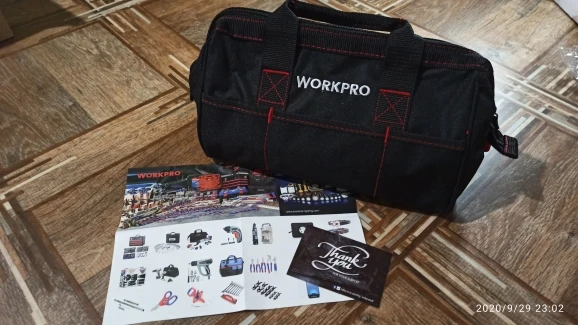 Посылка пришла за 2 недели до Сургута. Упакована в пакет и фирменную коробку, все соответствует. У данного прибора 6 скоростей, работает очень мощно. В комплекте сумка, разные насадки, шестигранник, одна батарея и зарядное устройство. Продавец надёжный, заказываю продукцию workpro него не первый раз. Рекомендую.