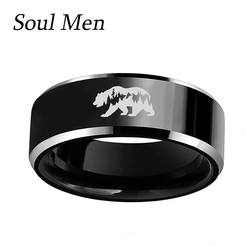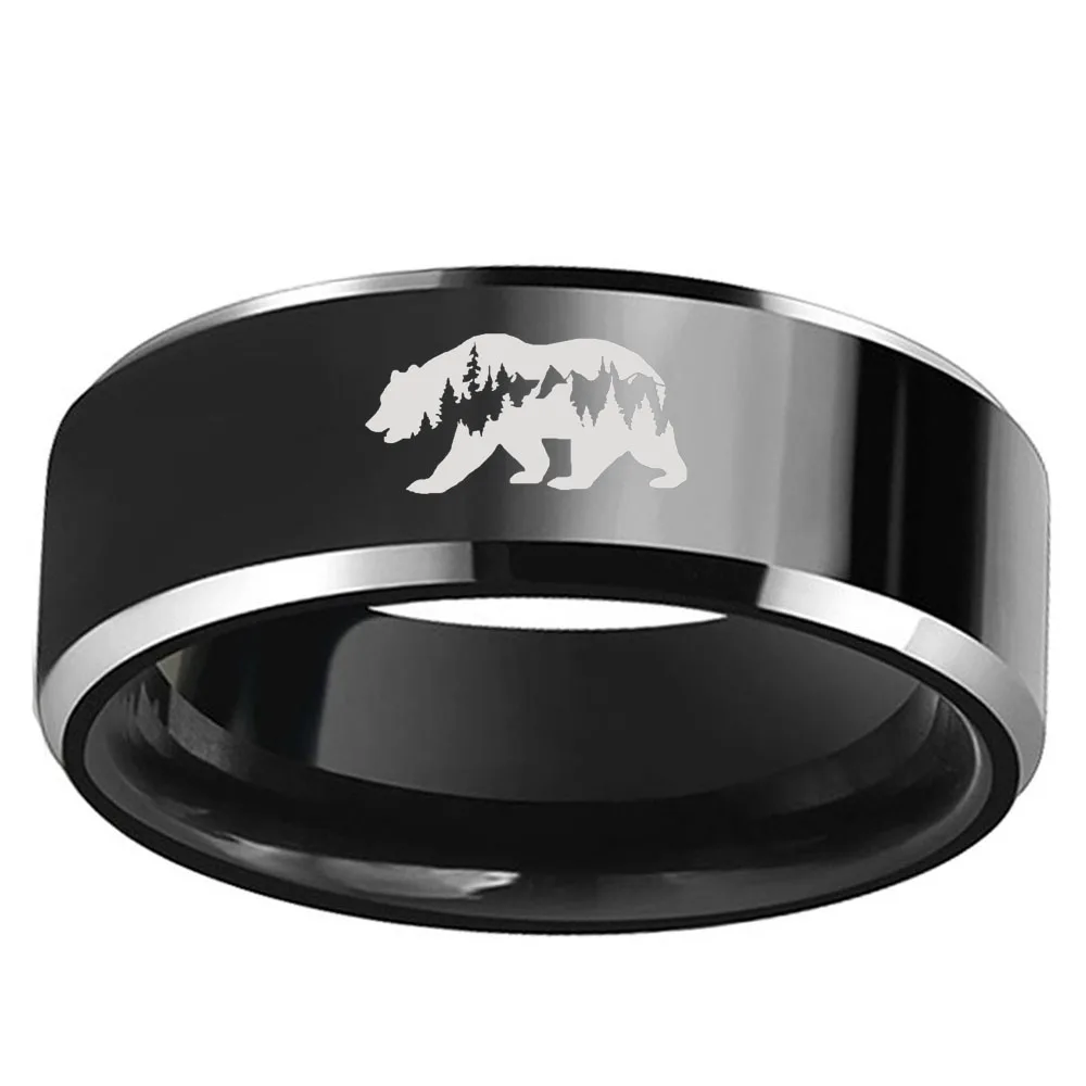 Мужское лазерное кольцо с мишками в горы, леса, ландшафта, полированное черное вольфрамовое кольцо для мужчин и женщин, специальное обручальное кольцо для мужчин