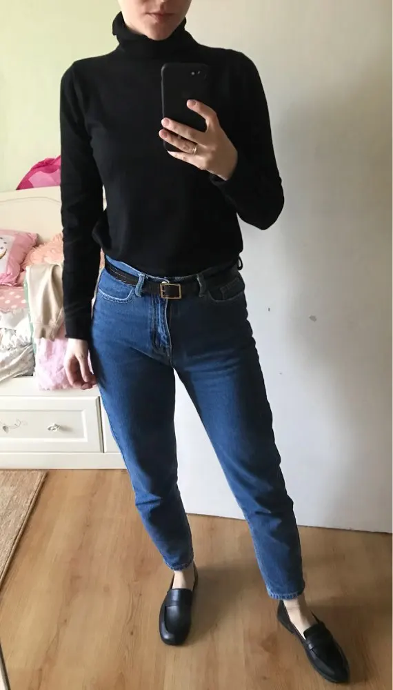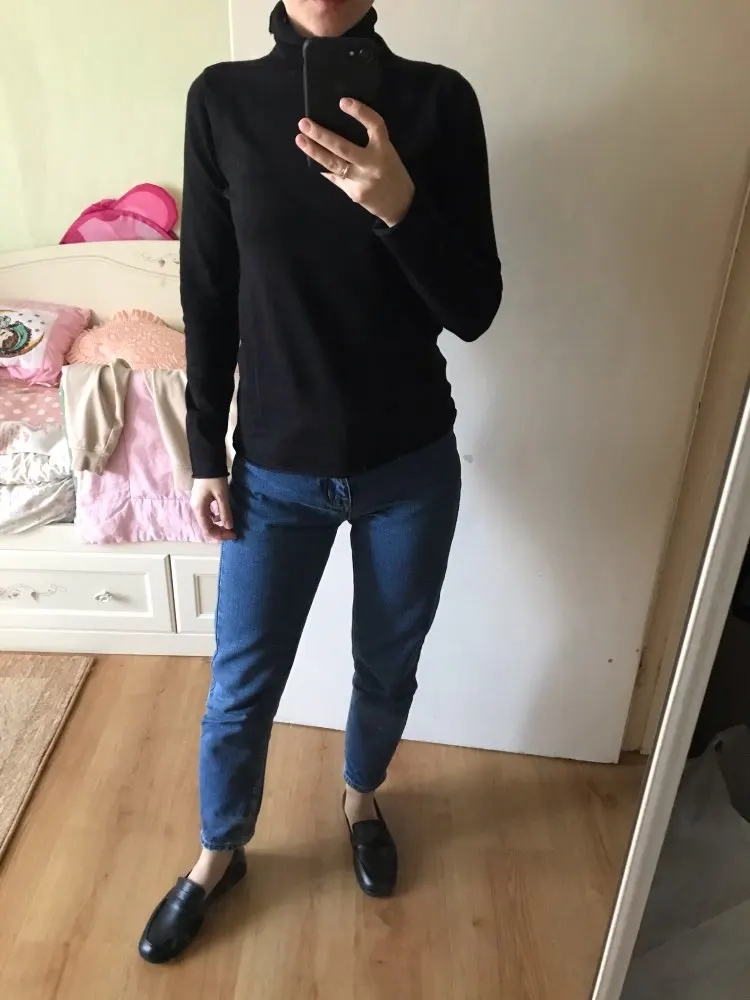 Отличная водолазка, мягкая, плотная, удобный ворот. На российский 42-44 села достаточно свободно, к телу приятная. Пришла быстро. Спасибо продавцу!