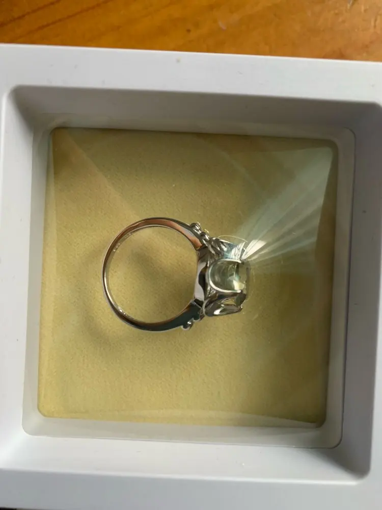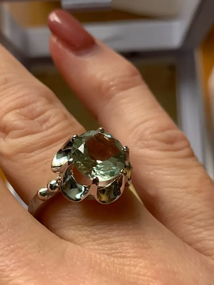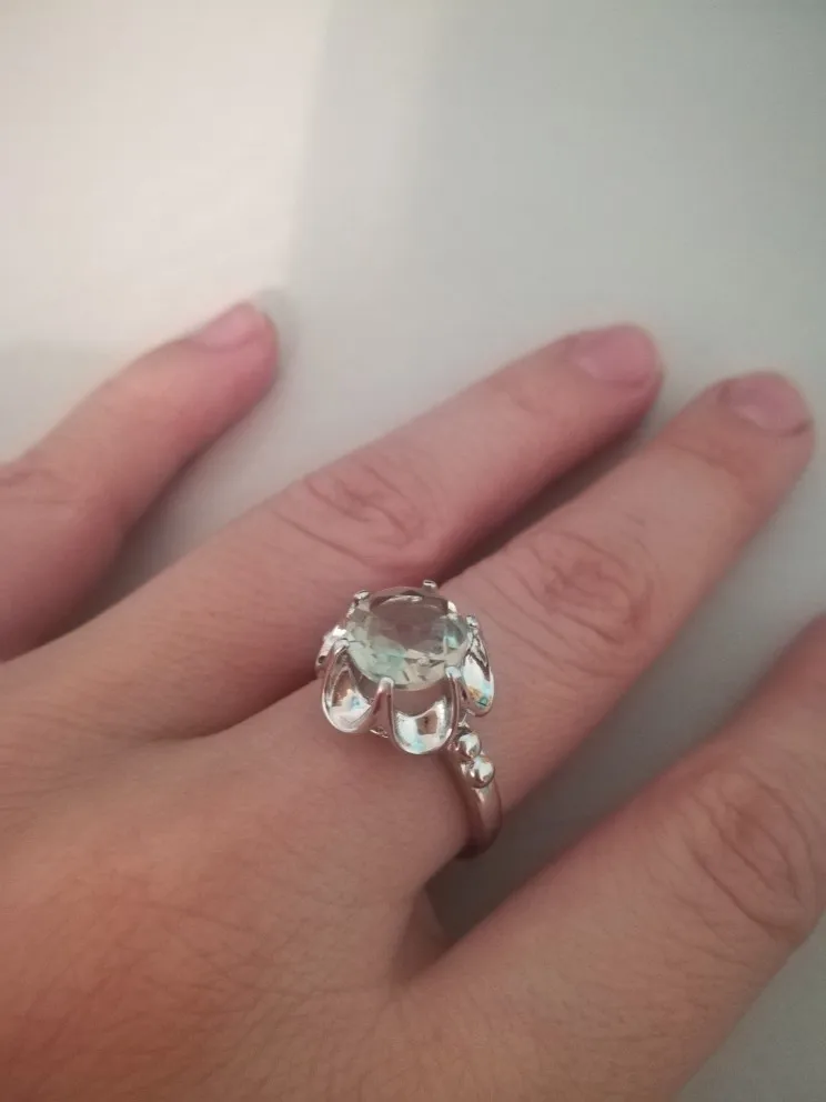 Очень красивое кольцо. Не маломерит. Проба стоит. Камень большой, цвет нежно-зеленый, красиво огранен. Упаковано было очень хорошо, в коробочку вложена мягкая салфетка. Доставка чуть меньше двух недель. Покупкой довольна. Продавца рекомендую.