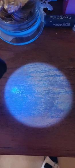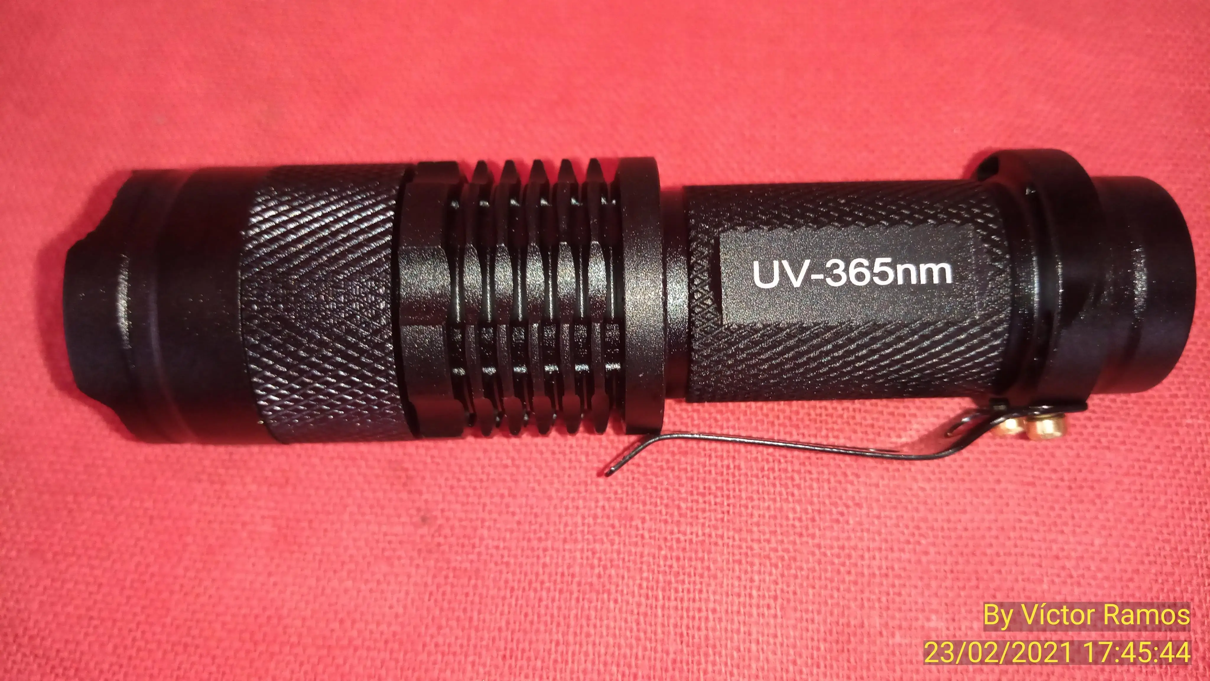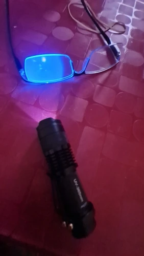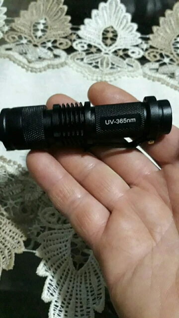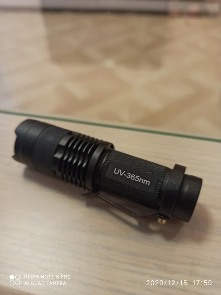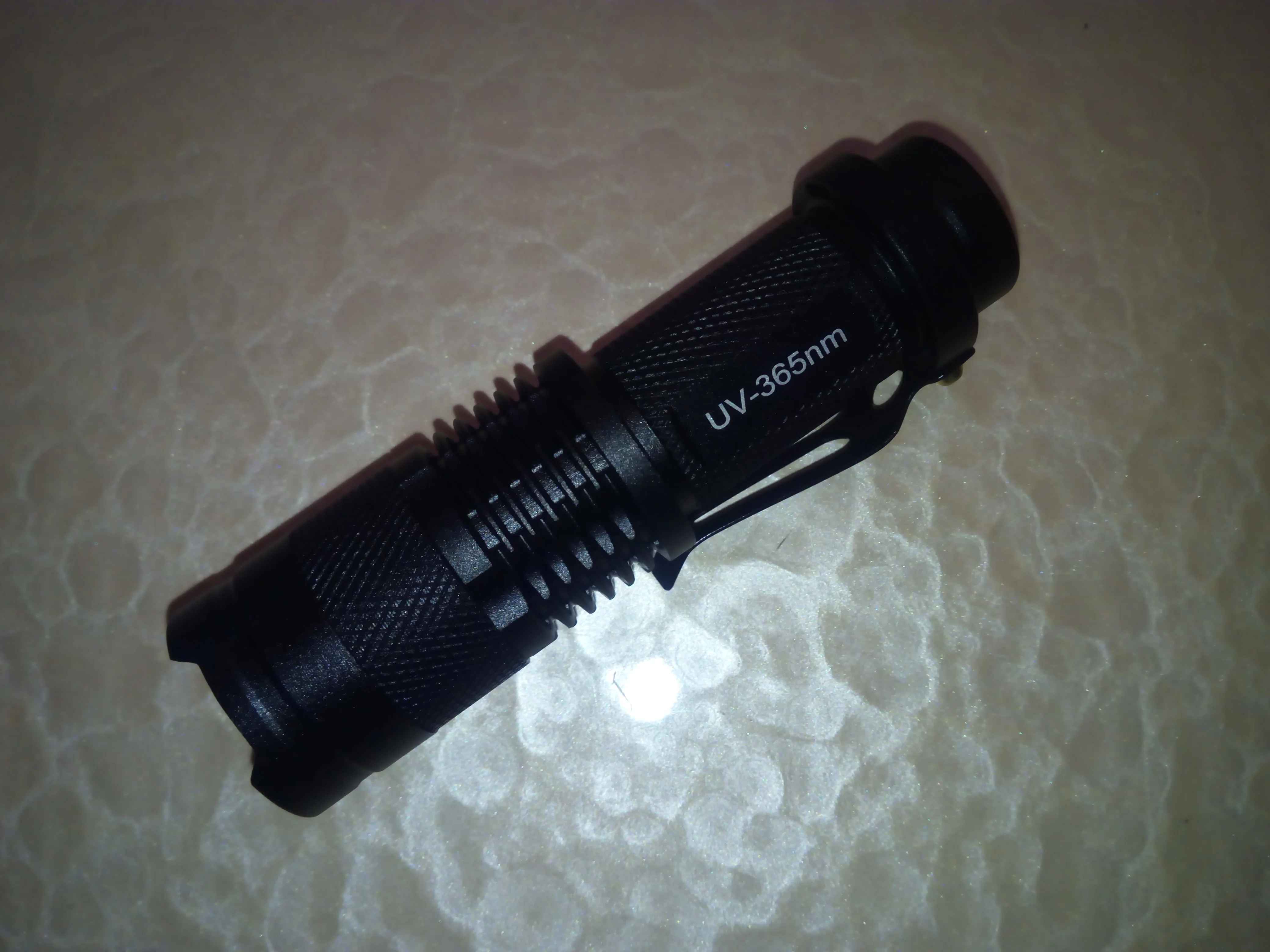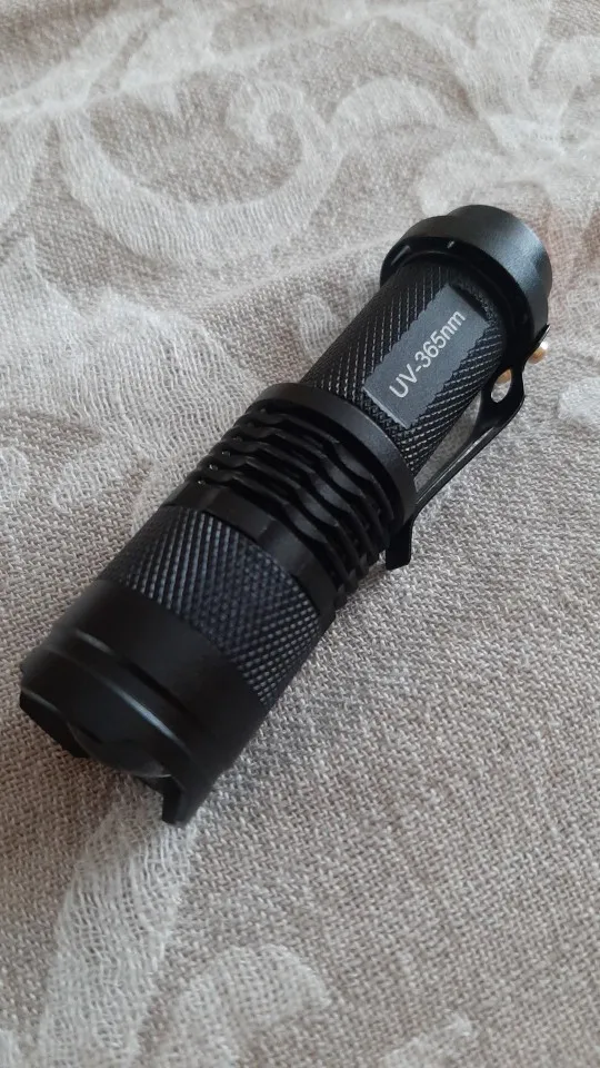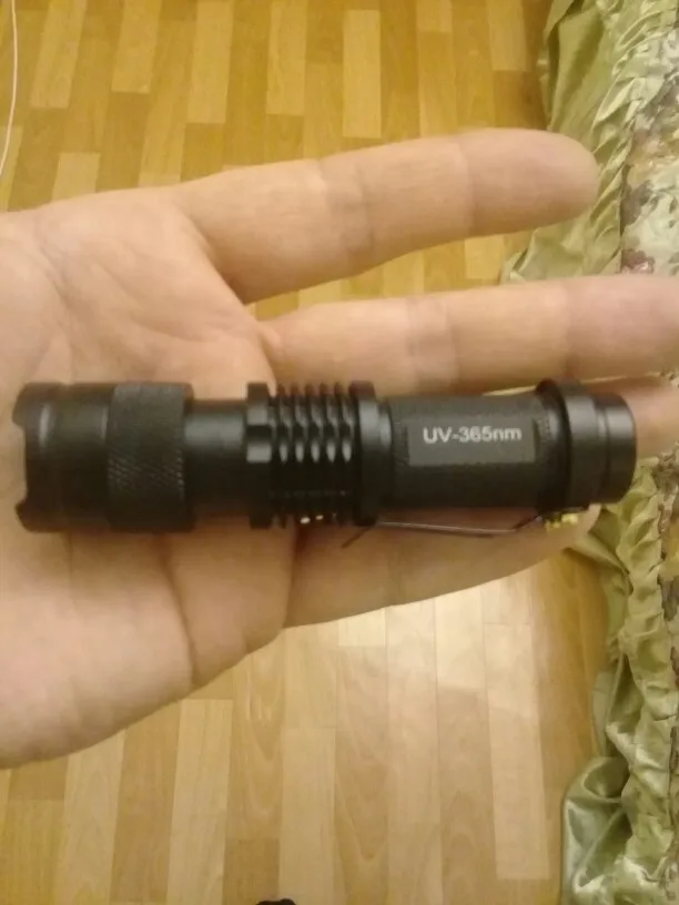 Фонарь работает. Имеет три режима - Полная мощность, половинная мощность и стробоскоп. На купюрах ничего не светится, так же не видно следов жизнедеятельности животных... А всё белое светится. Видимо я купил не ту частоту (365). Надо попробовать 395.